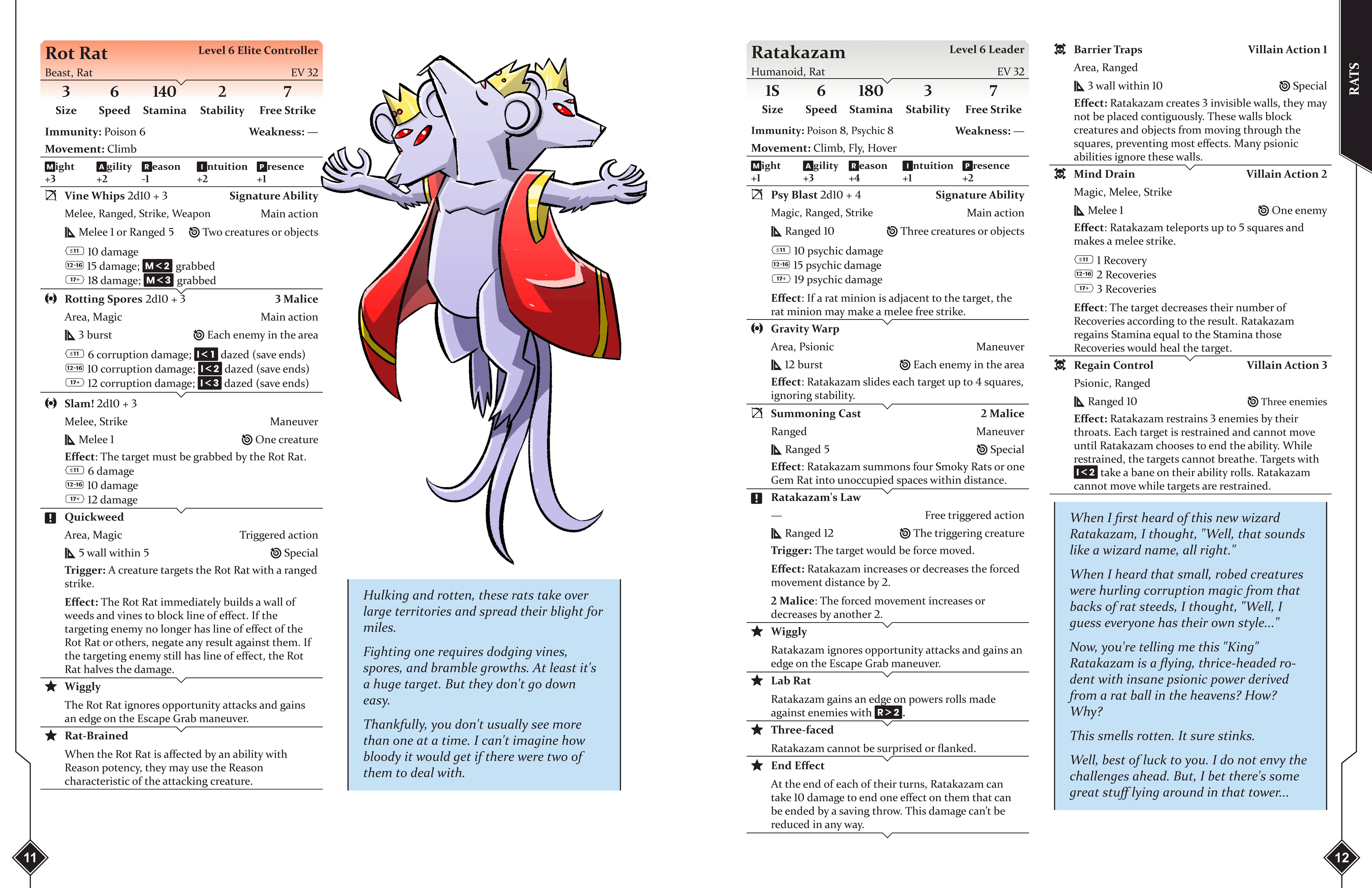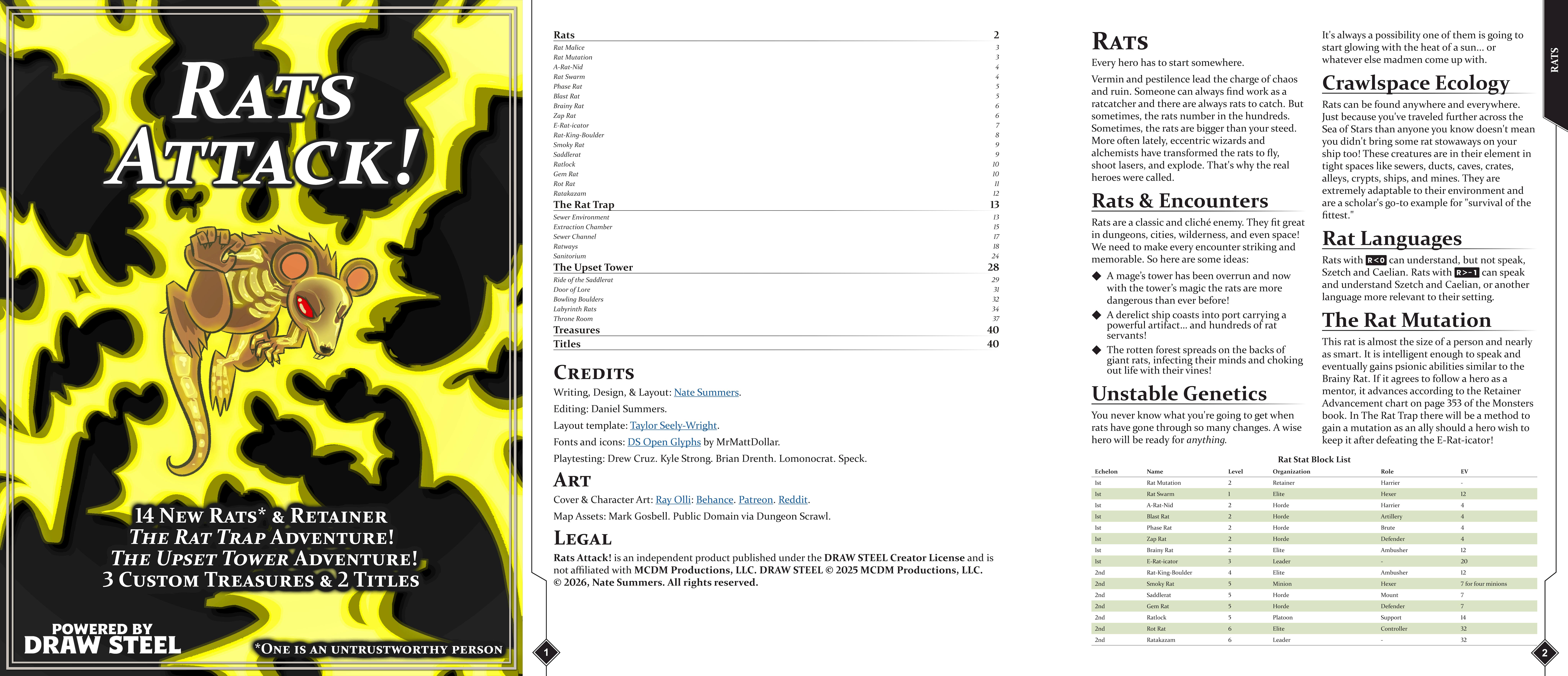 Rats Attack! is a 3rd-party monster and adventure pack for MCDM's tabletop roleplaying game Draw Steel. It's designed to give you even more fun monsters to run. Both adventures are easy to run so you can fill a session or two between your bigger plots.