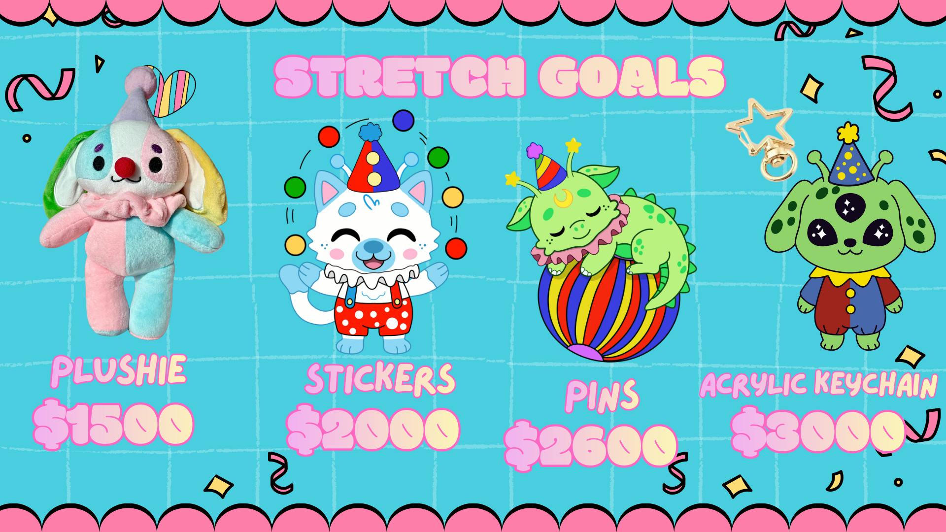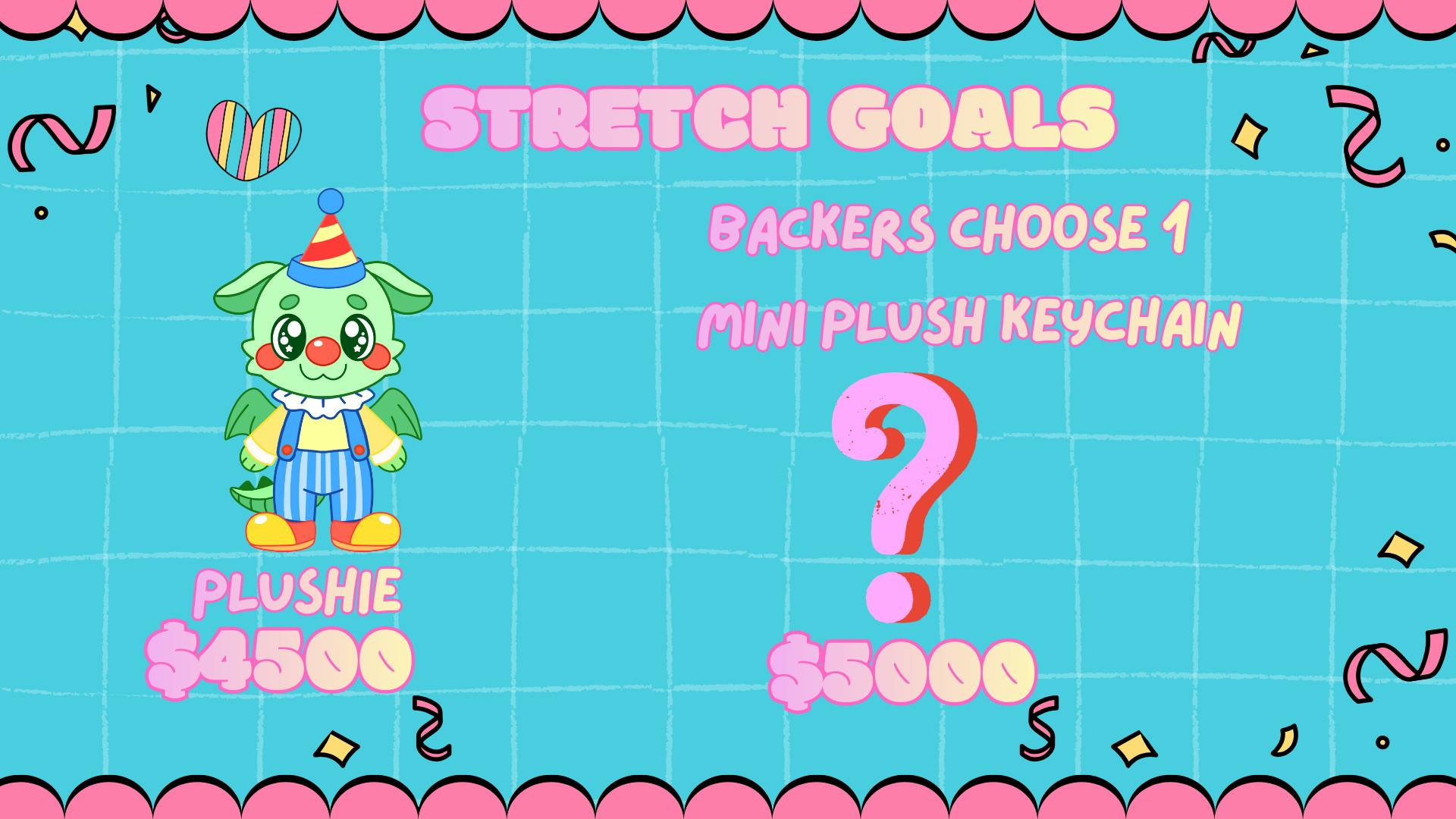 These are our stretch goals! Some fun goals we unlock as the campaign grows! 🤡 Nothing’s set in stone, so we might tweak things along the way based on your feedback and how the adventure unfolds! ✨