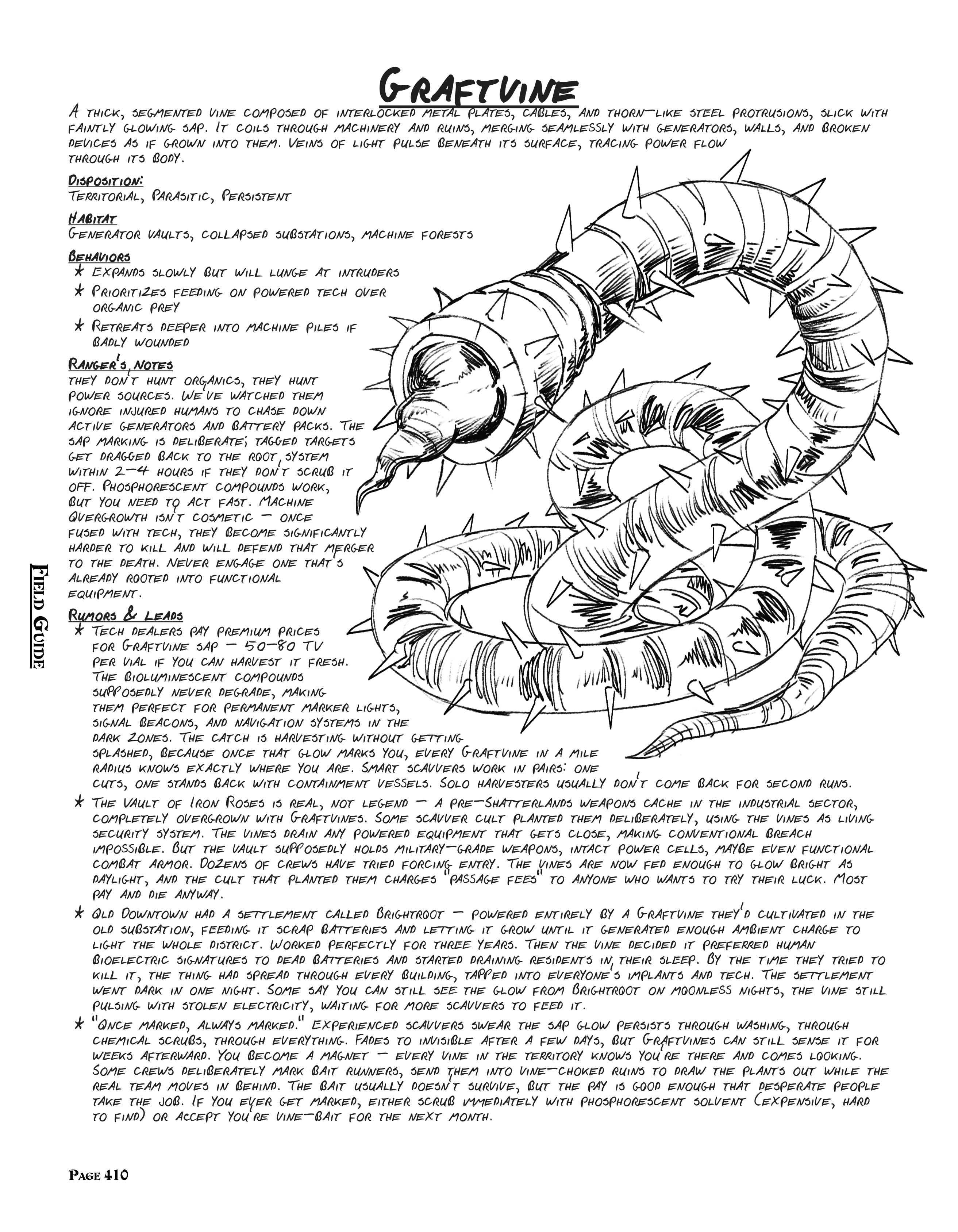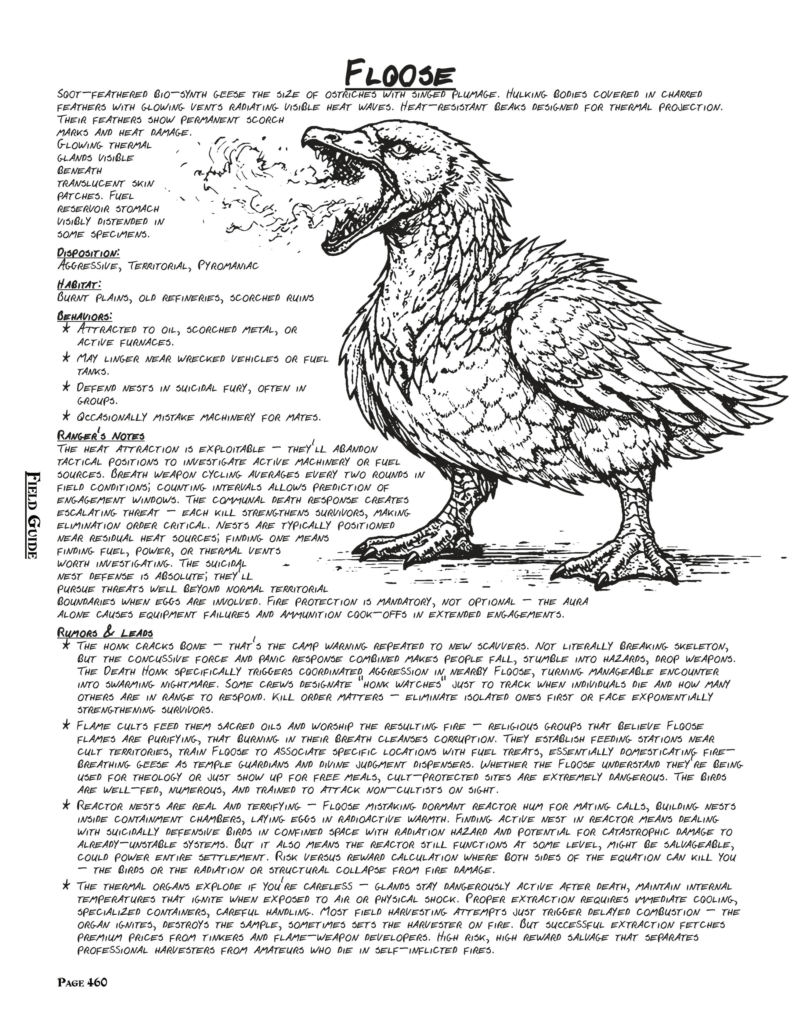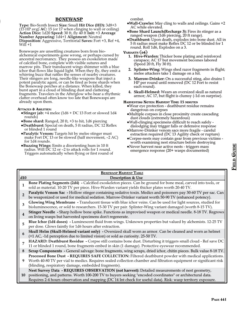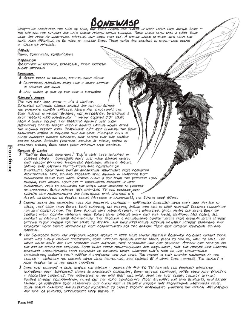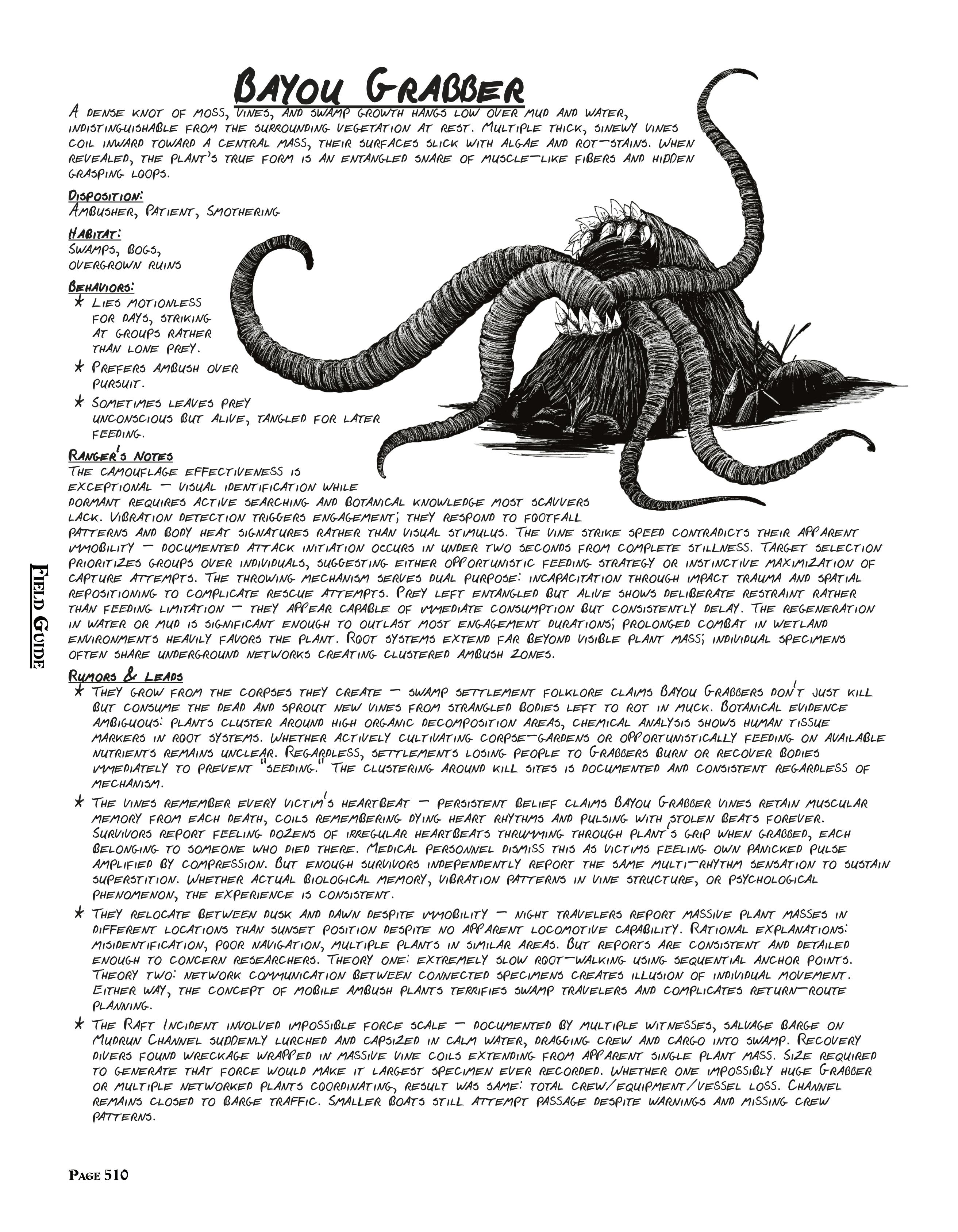 Preview of the Field Guide and some of the Creatures. All creatures have two pages of information, the player facing side is what the players could learn from interactions. And the Judge facing page, this all the technical stuff for running the creature