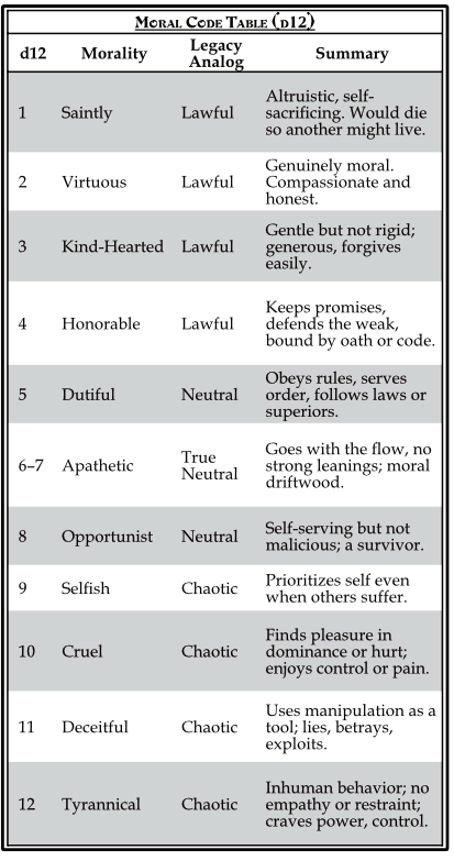 The Moral Code also adds three personality pillars that round out who your character is beyond their moral compass: