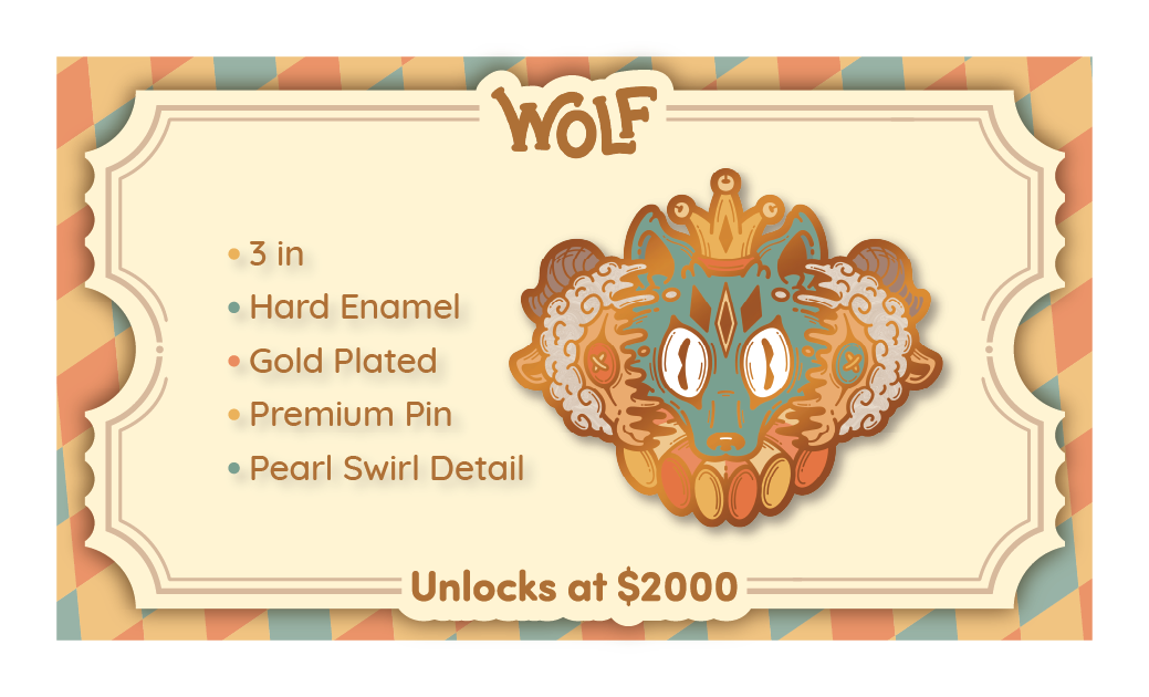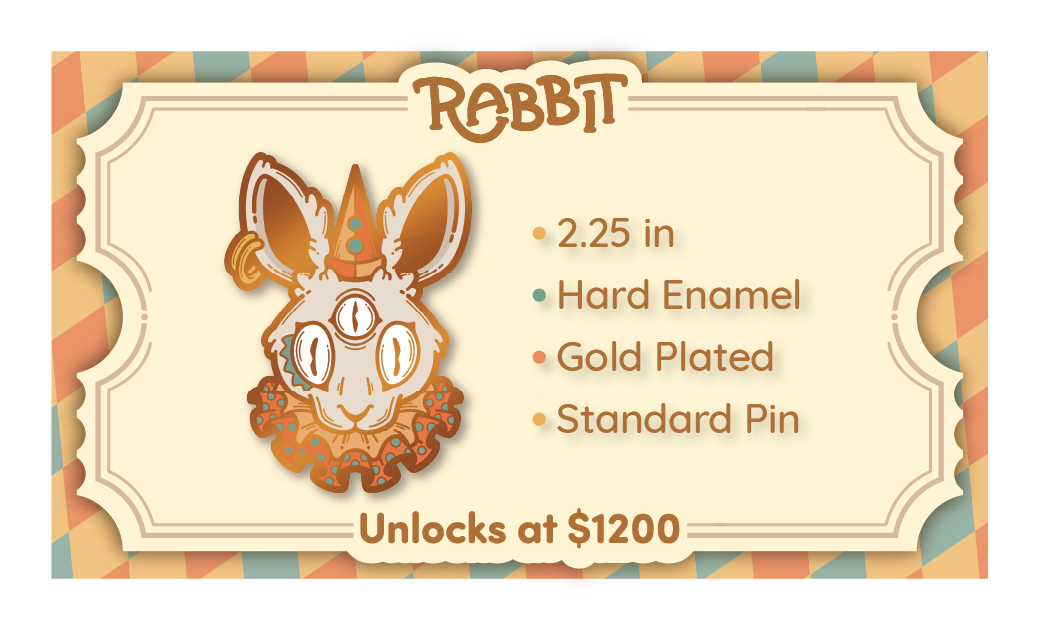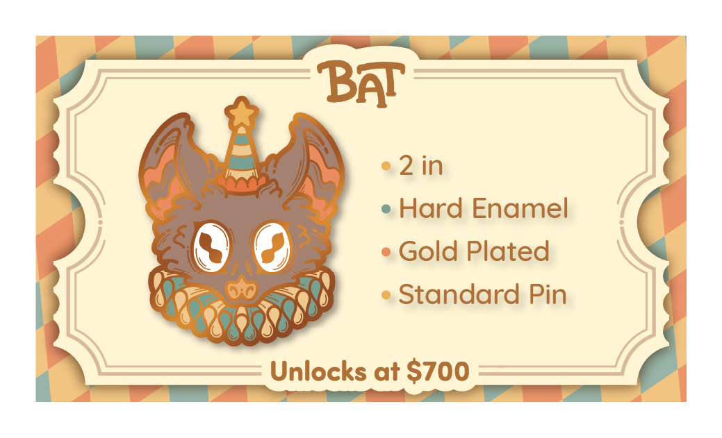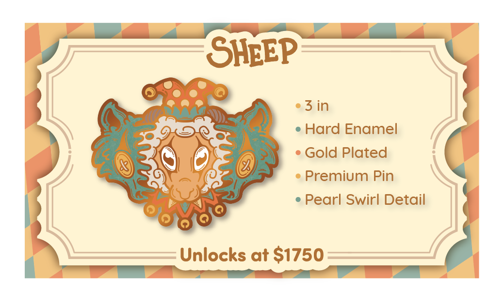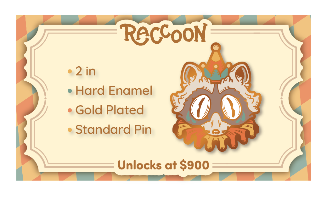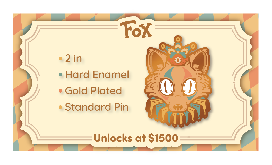 Carnival Critters includes the following 4 standard pins and 2 premium pins. The initial funding goal will unlock the first pin design and once each of the following stretch-goals are unlocked, they will be available for you to choose in your pledge level or as an add-on.