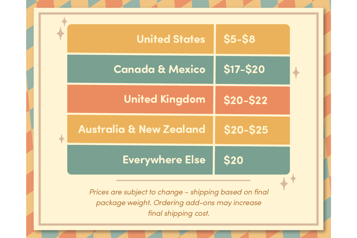 Shipping fees will be charged once the campaign has ended and shipping has been calculated in the survey. The info below is an estimate for shipping costs based on where it's going: