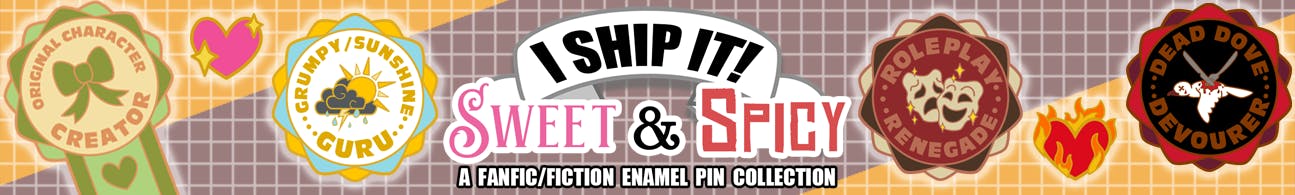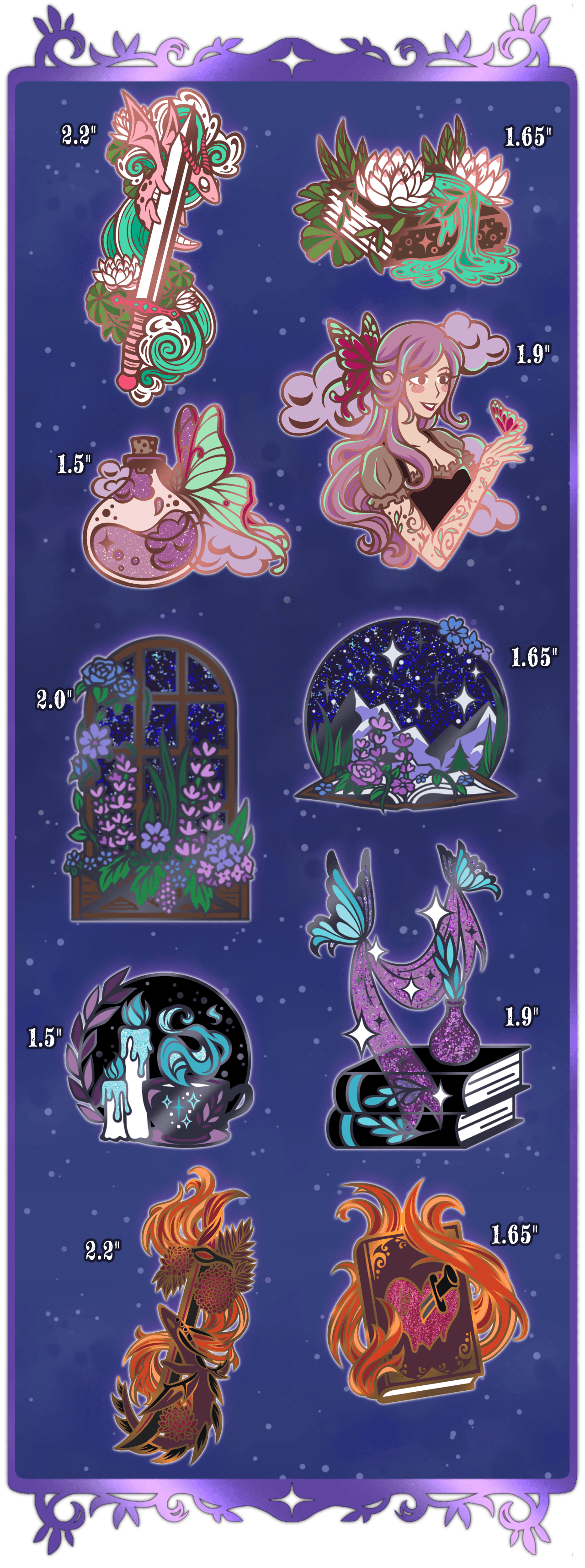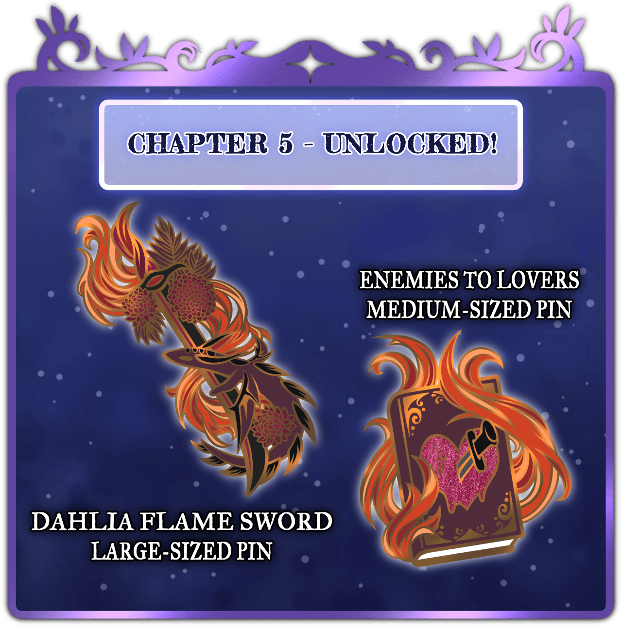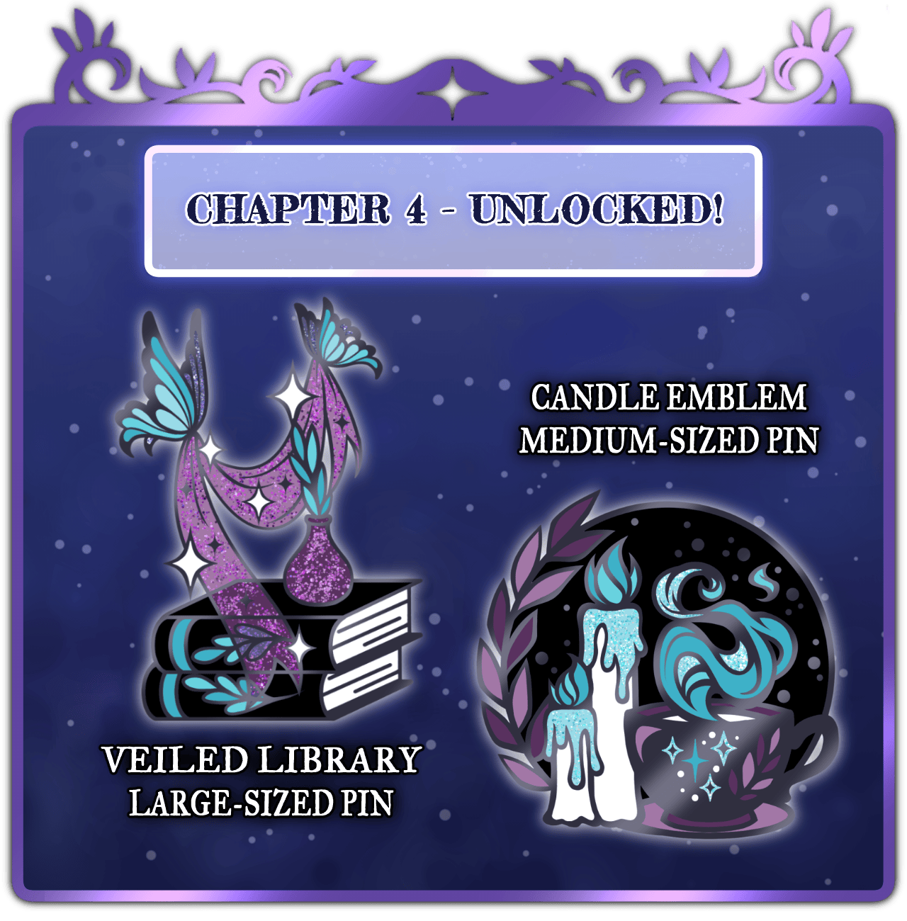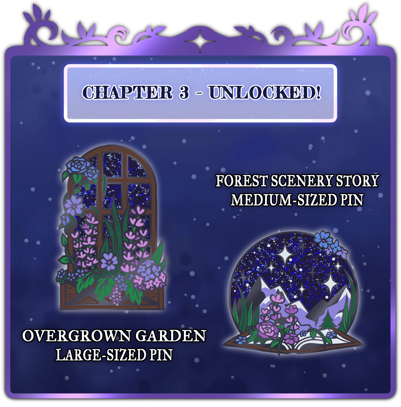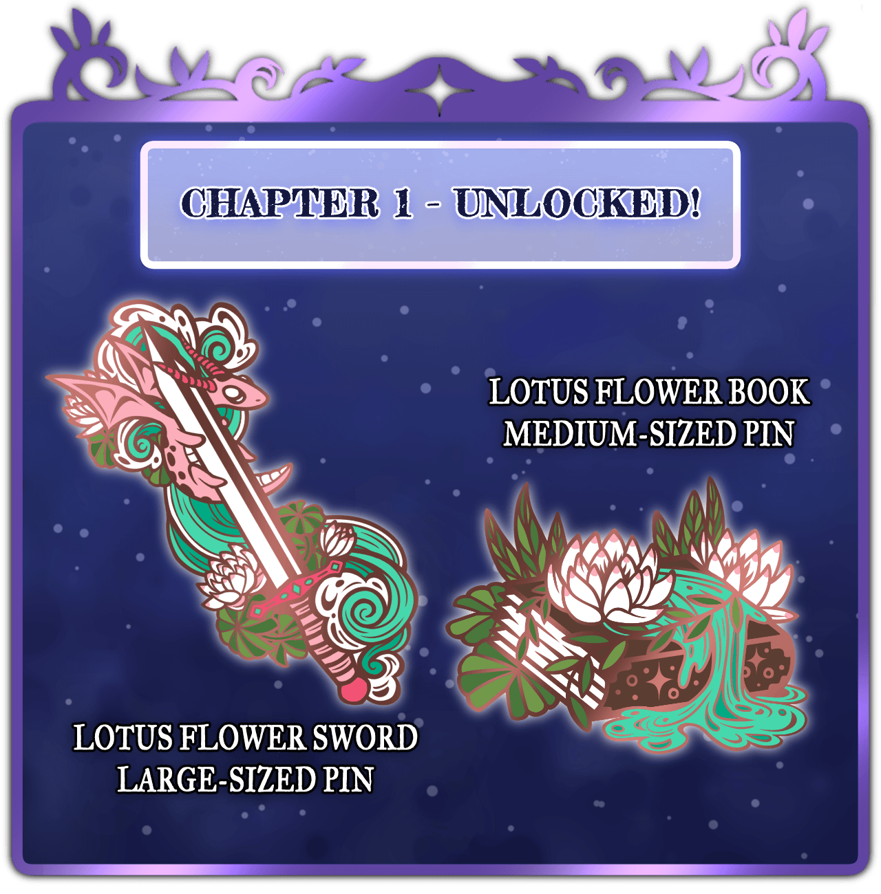 The pins are grouped up together depending on the 'chapter' they come from. If the chapter is 'unlocked' by reaching its funding goal, the pin designs then become available. Please check out the ⟡PROJECT GOALS⟡ to read more information about the goal and pin specifications.