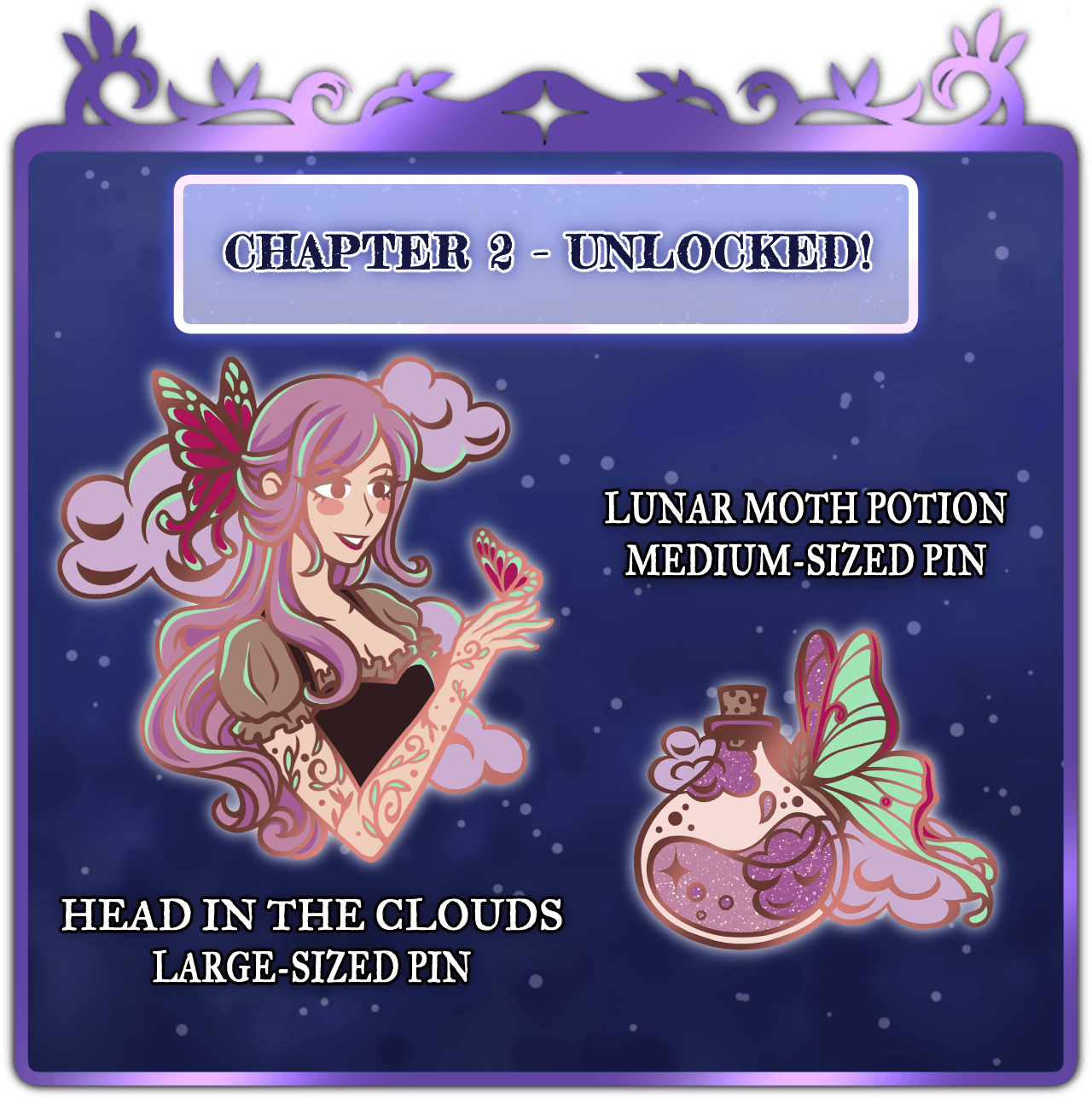 ⟡✦⟡ Lunar Moth Potion - Medium-sized Pin Pin type: Hard enamel Size: 1.5" inches Plating: Rose Gold 'The stars here look so different, they burn brighter. Perhaps beyond the overgrown cottage, answers are awaiting her.' ———✦Ch. 3 - NIGHT SKY ———✦ STRETCH GOAL ———✦ UNLOCKED AFTER $2250 ⟡✦⟡ Overgrown Garden - Large-sized Pin Pin type: Hard enamel Size: 2.0" inches Plating: Black Nickel