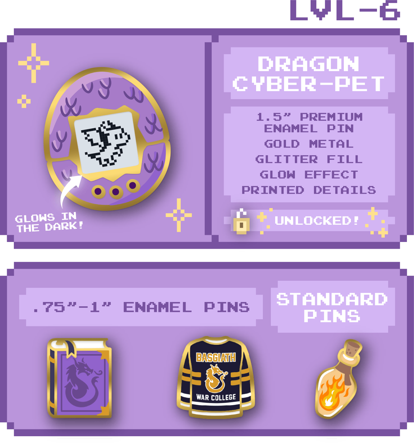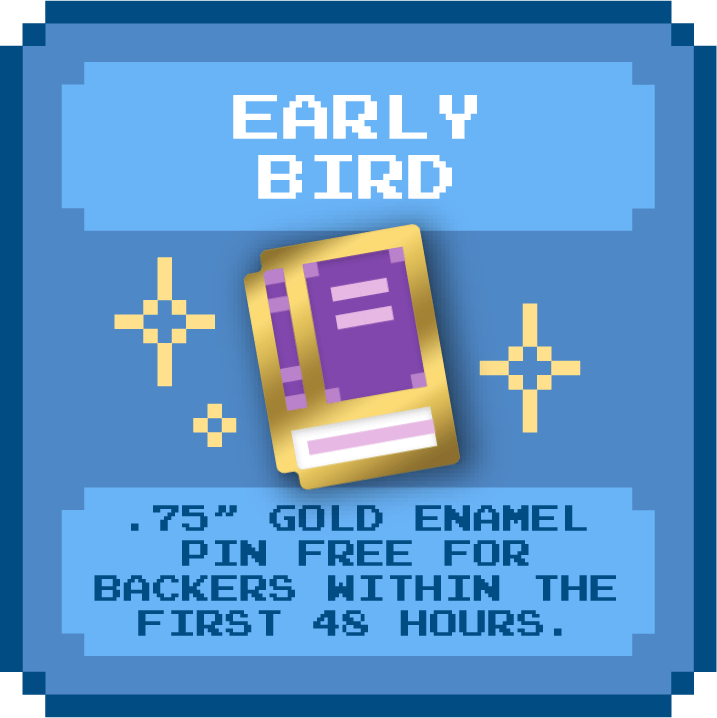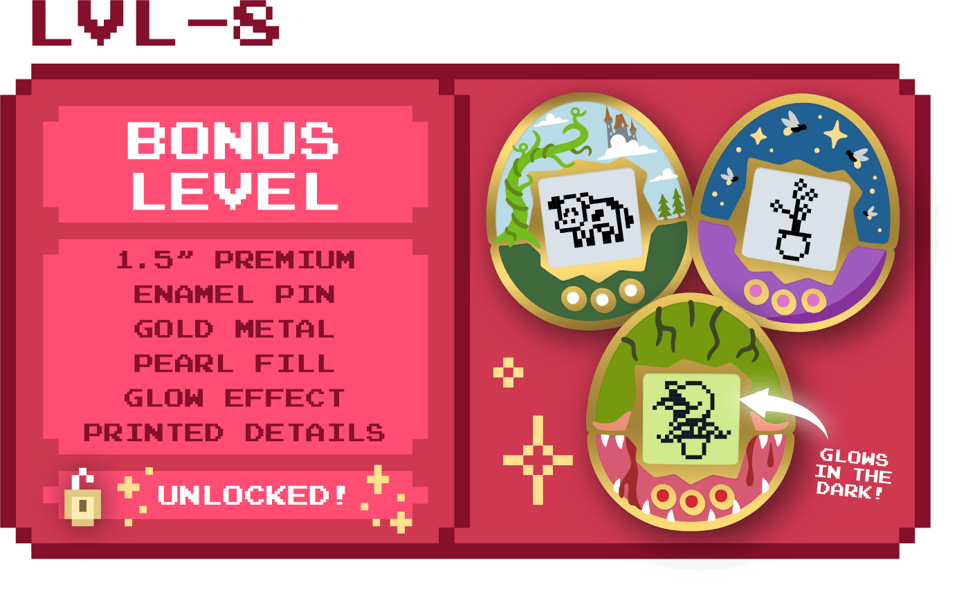 Fancy a little mystery? Receive one (1) pin in our blind bag add-on! You will randomly receive one of six color variants or the secret variant. Want all 6? Add 6 to your pledge.