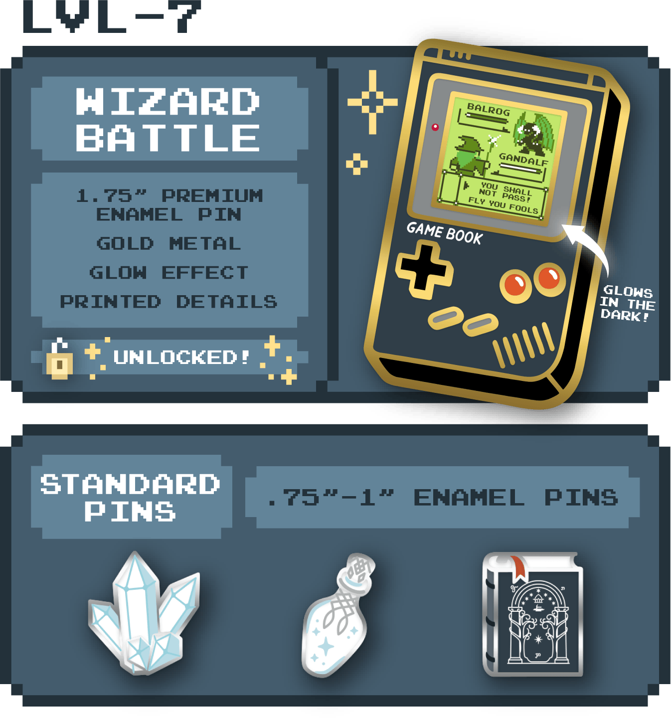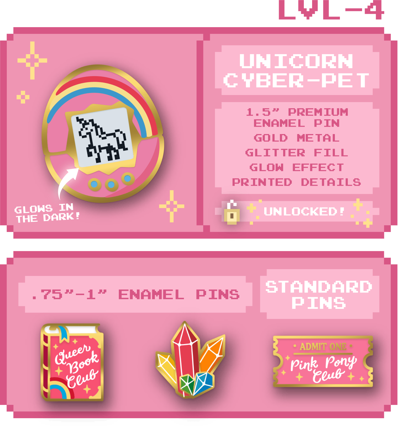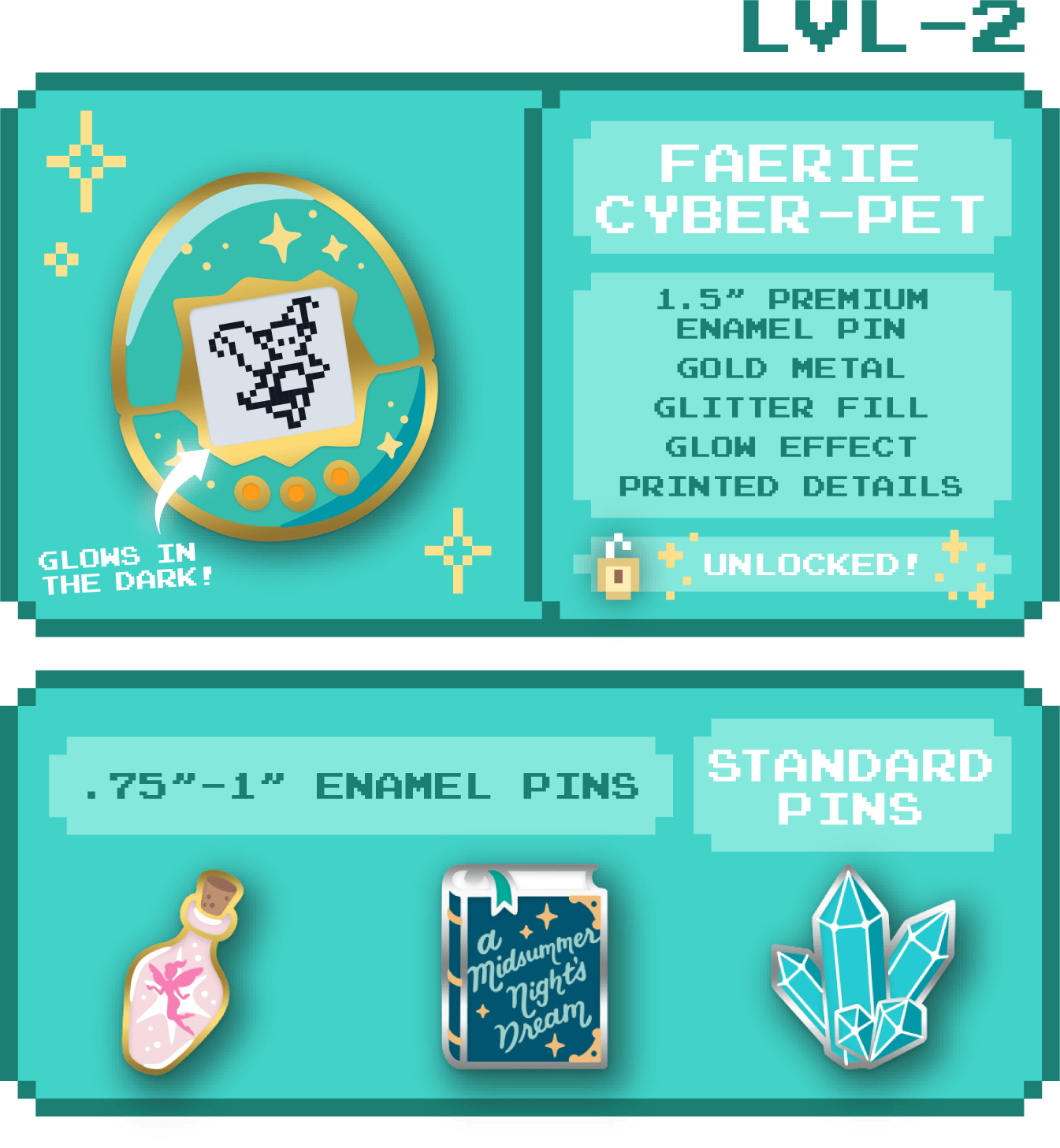 Fancy a little mystery? Receive one (1) pin in our blind bag add-on! You will randomly receive one of six color variants or the secret variant. Want all 6? Add 6 to your pledge.