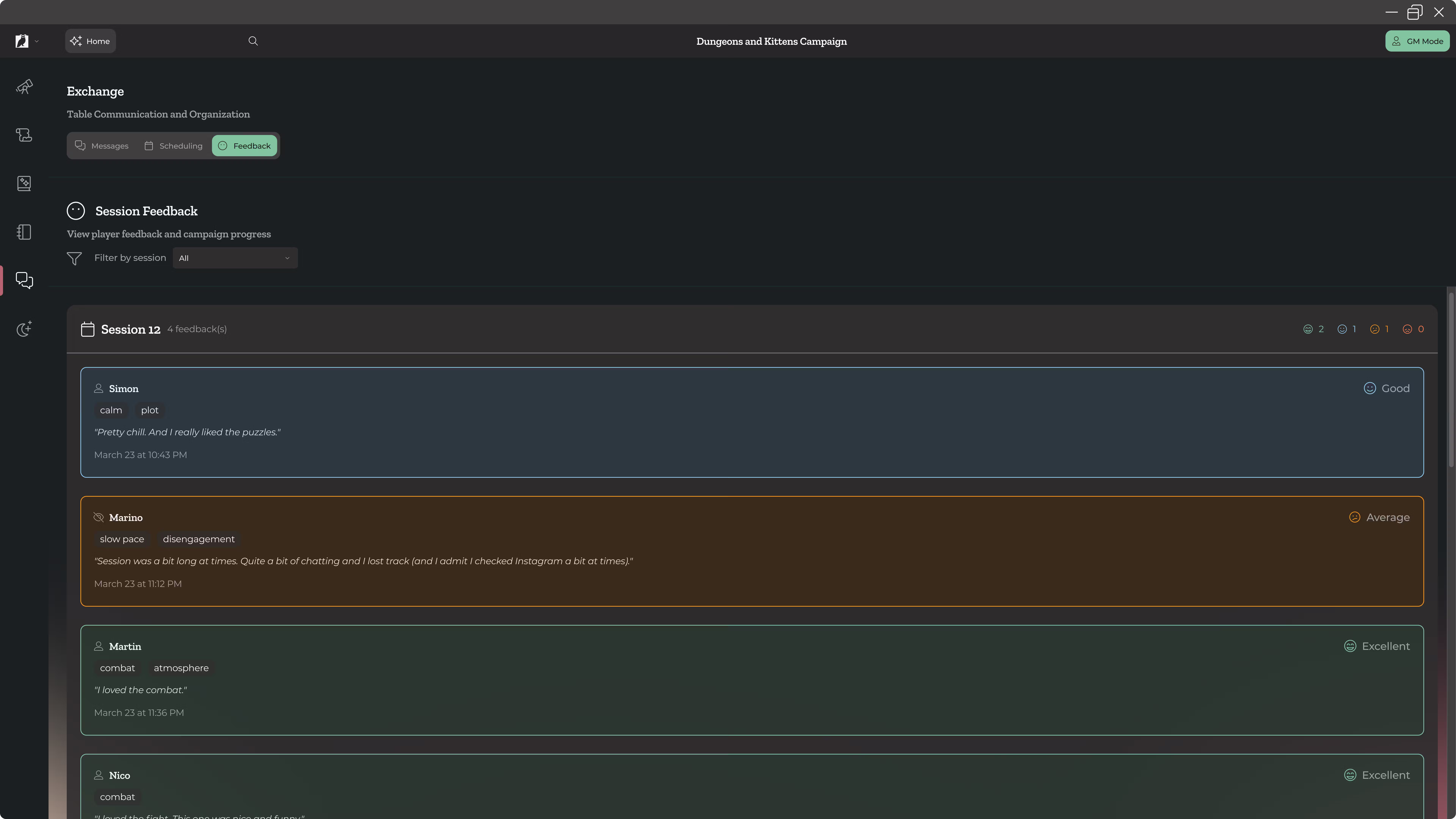 One important example of this is the ability for players to give private or public feedback about the sessions, so that you can be aware of their different needs, what they enjoyed the most, what they found issue with, and adapt your future sessions accordingly.