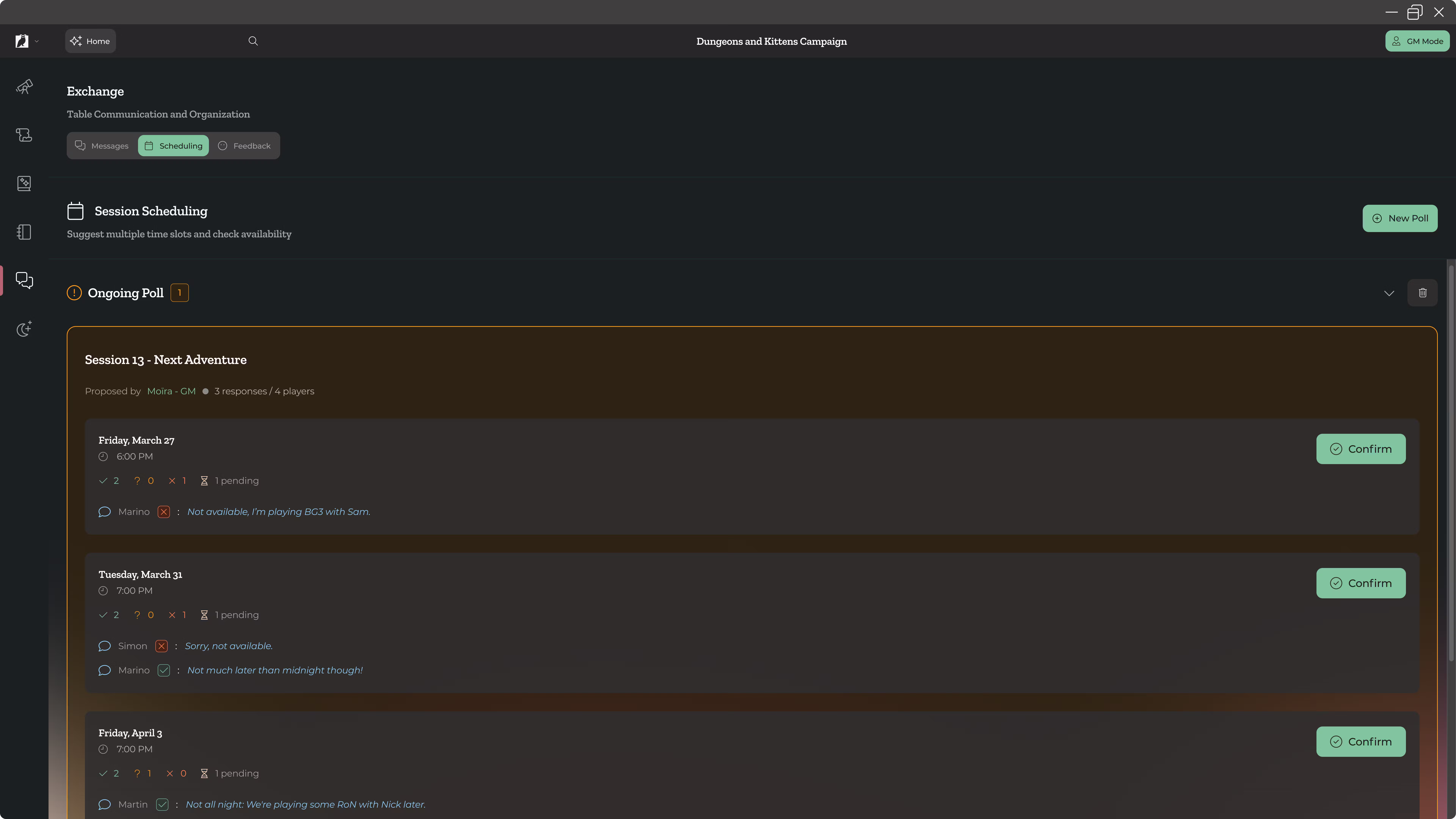 Grâce à ce système, les joueurs peuvent voter pour les différents créneaux proposés pour la prochaine session. Cela facilite énormément l'organisation et réduit le risque d’abandon de campagne. Réunir tout le monde autour d’une table ou sur un VTT peut en effet être aussi complexe que préparer un scénario ! Cette fonctionnalité fluidifiera cette partie souvent fastidieuse du jeu de rôle.
