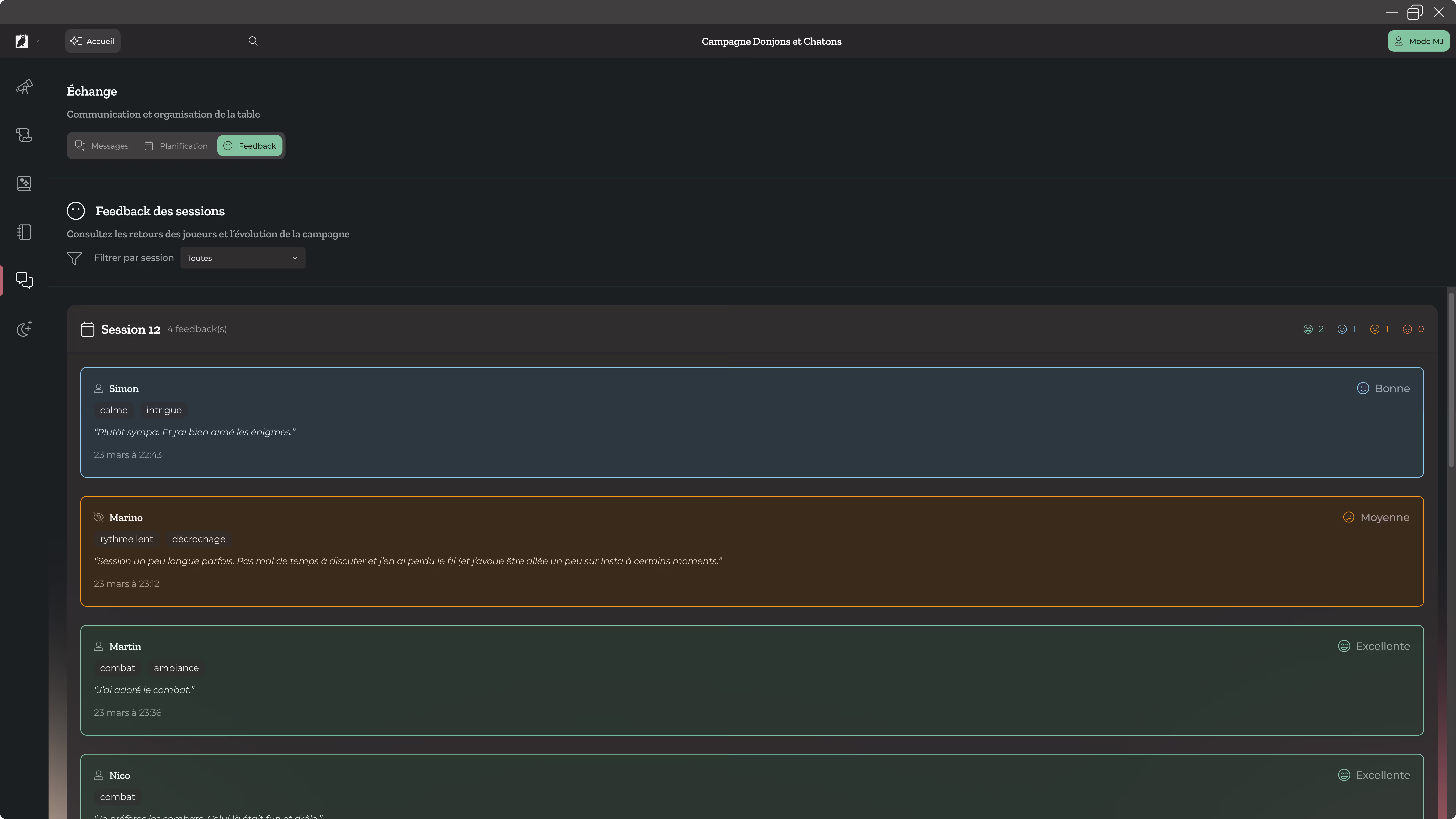 Par exemple, sur Scry, les joueurs pourront donner un feedback public ou privé sur les sessions. Cela vous permettra de mieux comprendre leurs besoins, ce qu’ils ont aimé, ce qui a posé problème, et d’adapter vos futures sessions en conséquence.
