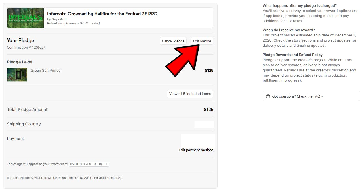 Review and update your Pledge Level selection - for example, you can pledge to the Newly Crowned level during the Crowdfunding campaign and then switch to the Green Sun Prince level once we know shipping costs and are preapring to fulfill the hardcover rewards