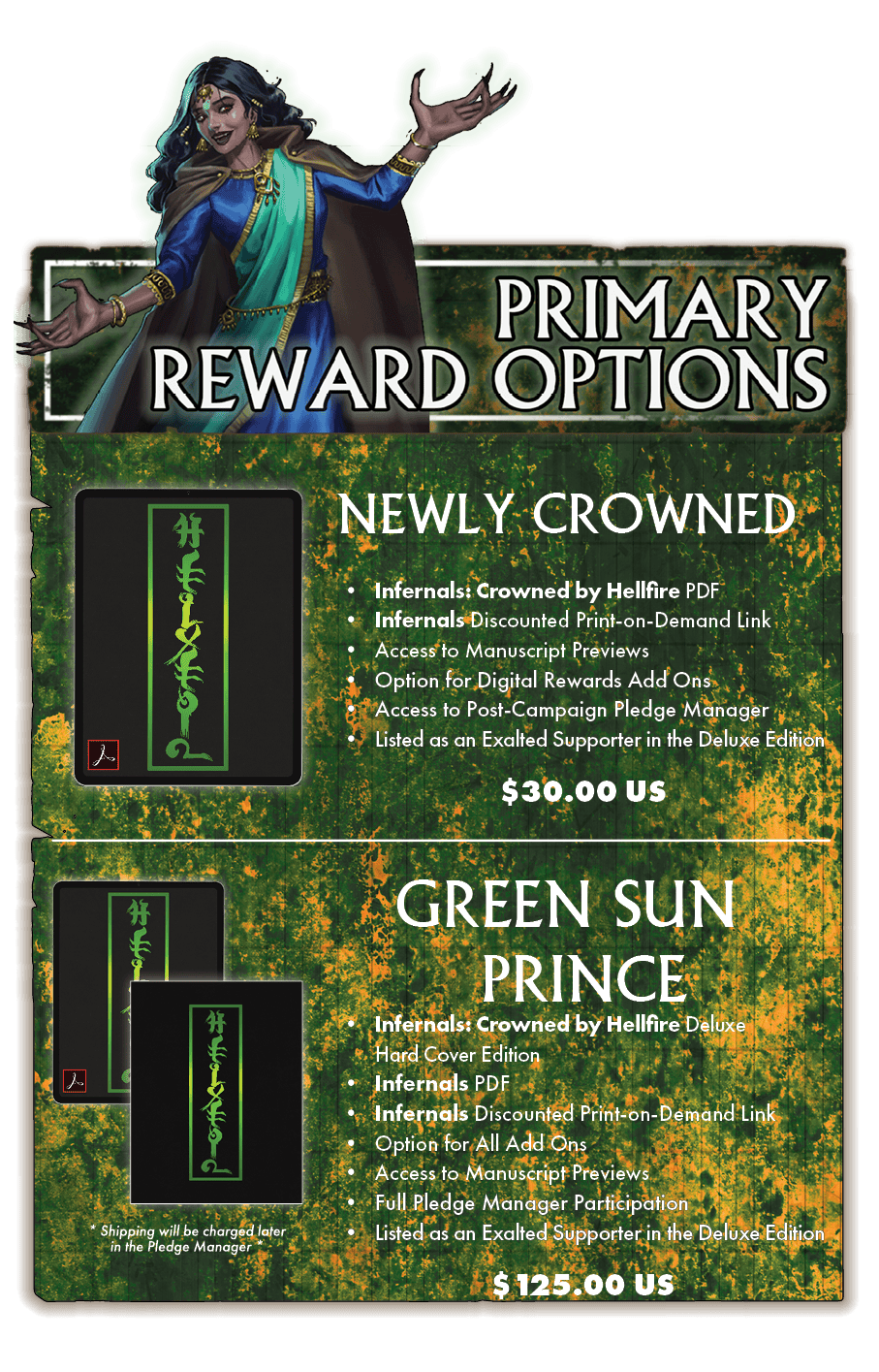 INFERNALS: CROWNED BY HELLFIRE DELUXE HARDCOVER BOOKS - The main goal of this campaign is to fund the creation, production, and print run of a standard and limited edition deluxe hardcover editions of this book. Note that all Reward Tiers that include the physical hardcover version also include the digital PDF version as a bonus. Shipping costs ARE NOT included in the cost of your pledge. You will be charged for shipping after the campaign through the pledge manager prior to hardcover reward fulfillment.