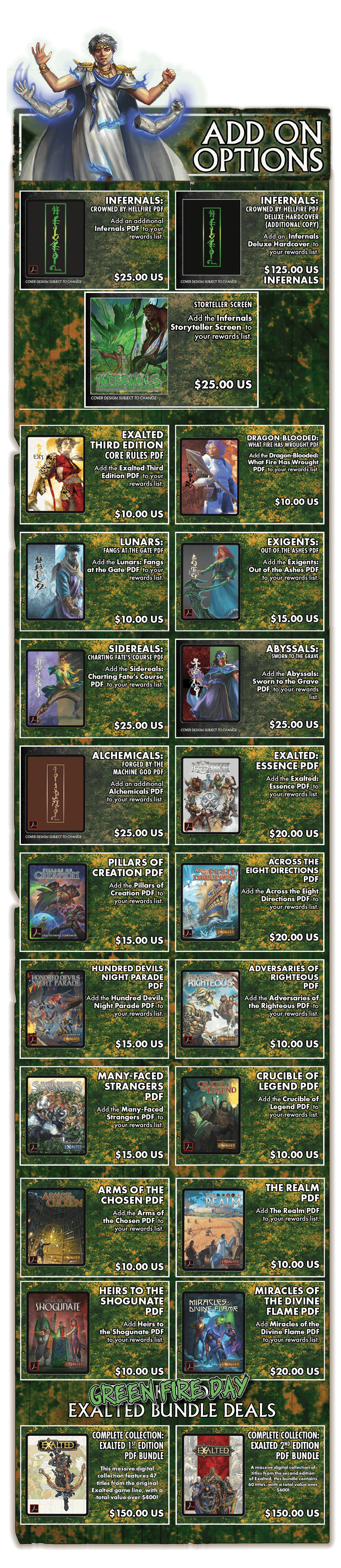 We offer Add On options that will let you add additional copies of the PDF or deluxe hardcover to your rewards list, as well as the Storyteller Screen we unlocked via Stretch Goals earlier in the campaign. Beyond that, Onyx Path is also offering digital version of previous Third Edition releases, some material that utilizes the Exalted: Essence system, and two big bundles of previous edition material only available during this campaign.
