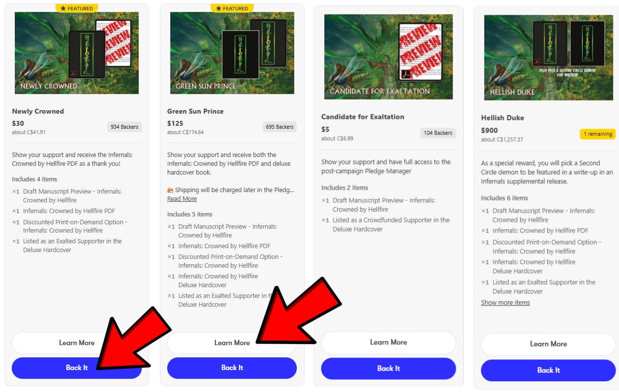 Using myself as an example, I'm looking at the Infernals deluxe hardcover book. Once I click BACK IT, I see my pledge level options. If I want to know a bit more about each level, I can click Learn More, or if I know what I'm looking for, I can click Back It.