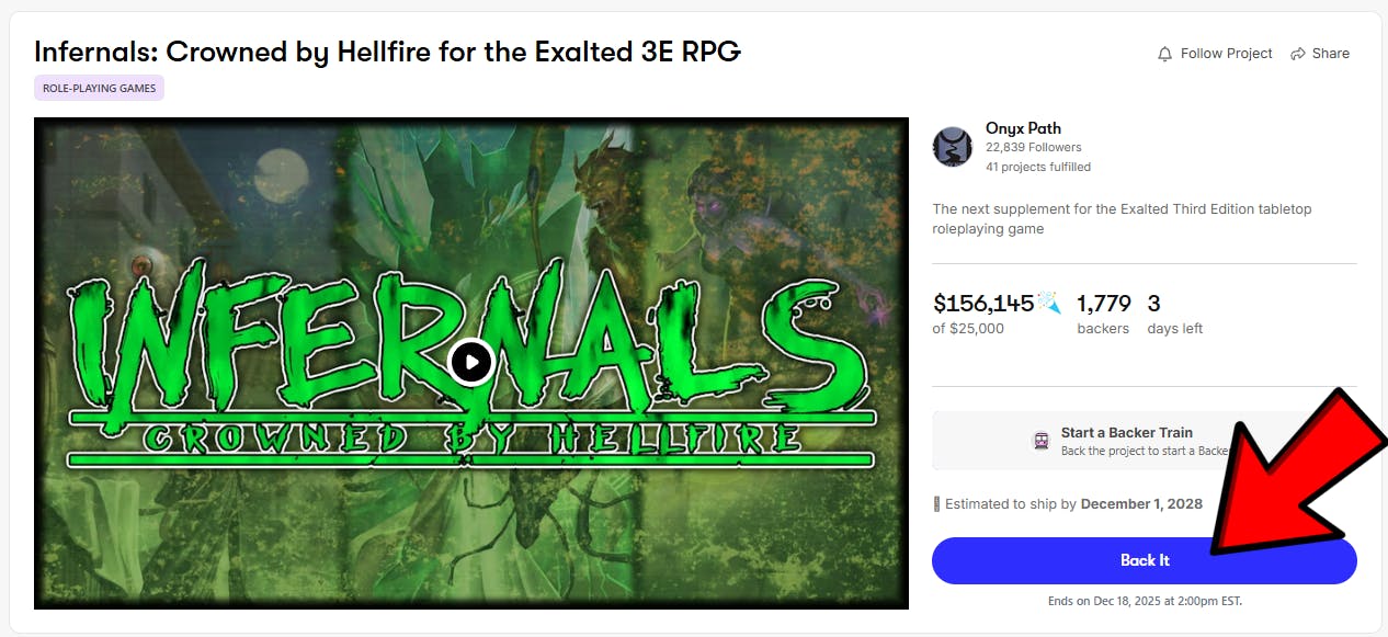 Pledging to the campaign also opens up the Stretch Goal rewards as thanks for your participation. We'll review our Stretch Goal accomplishments on Wednesday, but it's important to note that backers who wait and Pre-Order the Infernals: Crowned by Hellfire book at a later date will not have any Stretch Goal rewards automatically added to their rewards list, though many of the rewards we've unlocked are things that will be open to the Onyx Path community as a whole and eventually released for purchase on DTRPG.