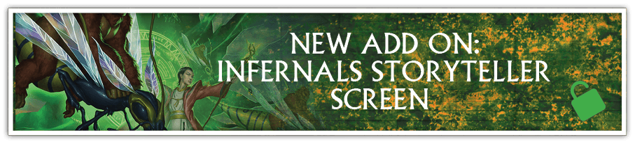 NEW ADD ON: INFERNALS STORYTELLER SCREEN - A three-panel Storyteller Reference Screen with charts and information for running an Infernals game will be created and offered as an Add On to any hardcover reward tiers for +$25.