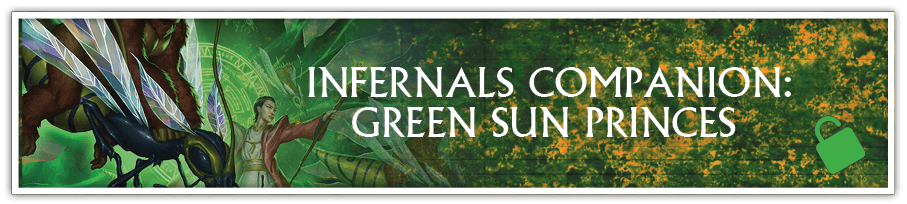 INFERNALS COMPANION SUPPLEMENT: GREEN SUN PRINCES - Quick Character traits for a variety of Infernal Exalted will be added to the Infernals Companion supplement. Backers receiving the Infernals PDF will receive the Infernals Companion PDF as a bonus reward. Backers receiving the Infernals Deluxe hardcover will also receive links to purchase a discounted Print-on-Demand version of the Infernals Companion book.