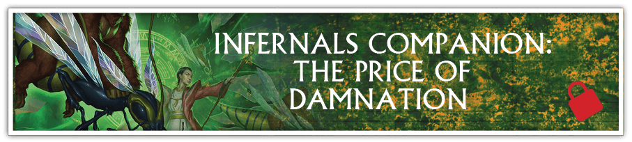 INFERNALS COMPANION SUPPLEMENT: THE PRICE OF DAMNATION - An in-depth look at the forbidden pacts and unholy power of warlocks, including the temptation of new Eclipse Charms will be added to the Infernals Companion supplement. Backers receiving the Infernals PDF will receive the Infernals Companion PDF as a bonus reward. Backers receiving the Infernals Deluxe hardcover will also receive links to purchase a discounted Print-on-Demand version of the Infernals Companion book.