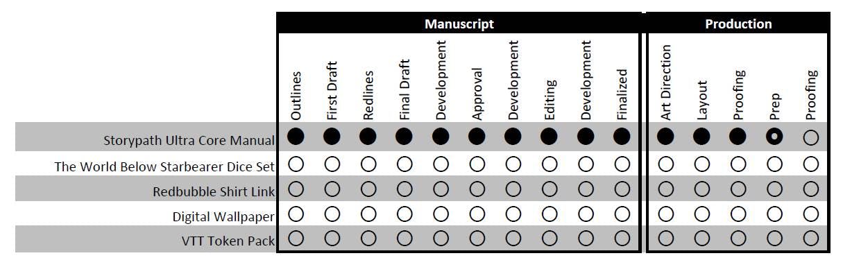 With the Storypath Ultra Core Rulebook now available in PDF and Print-on-Demand, focus turns to getting this added to Onyx Path's print queue, so that the crowdfunded hardcovers can be manufactured and sent out as a thank you to supporters. Manufacturing challenges hit Onyx Path pretty hard last year, but they've recently found a new print partner and completed their first project with them. Now that they've run through the A to Z of a production cycle, they're able to start slotting in delayed projects and start working through the backlog.