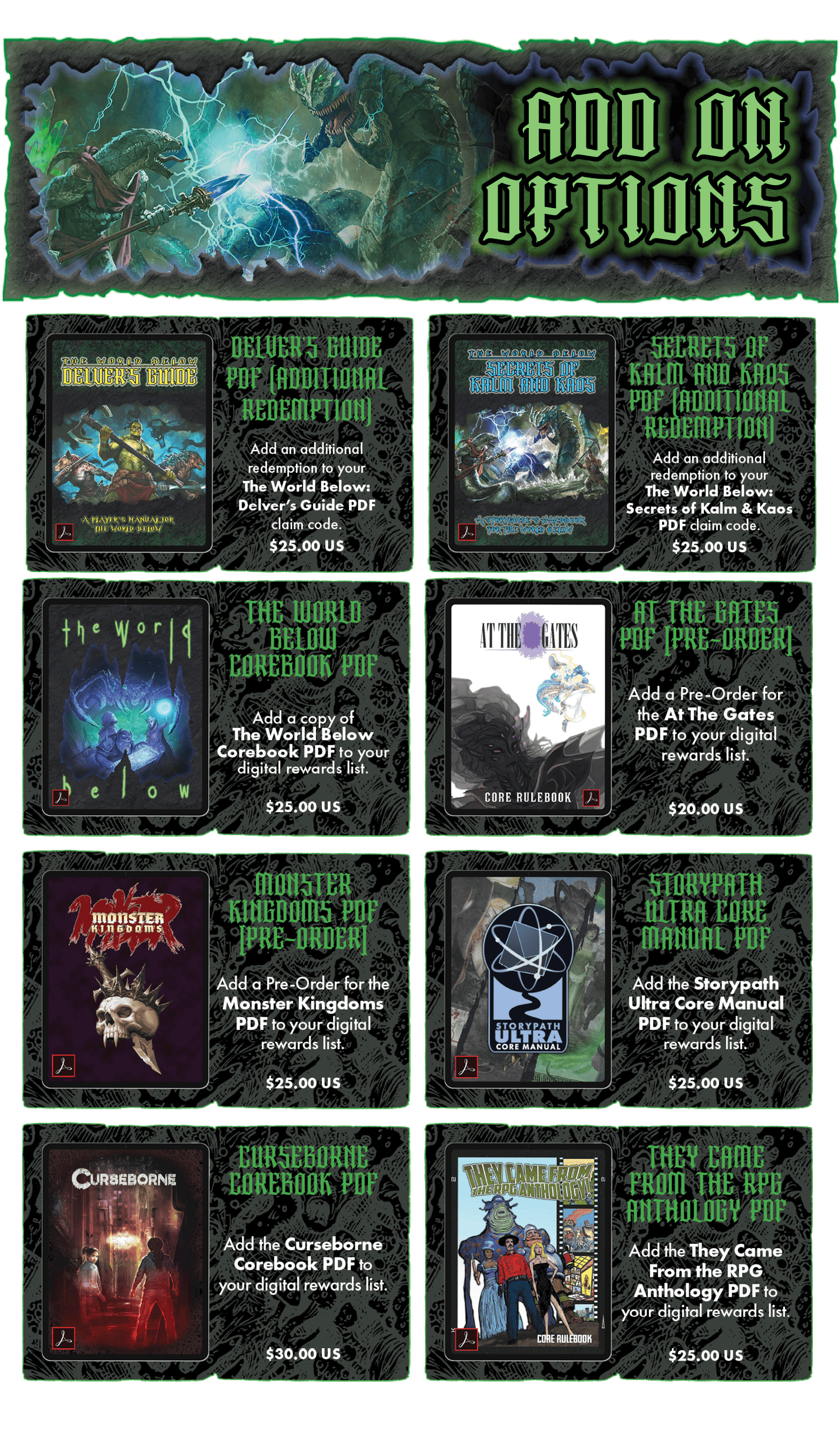 PDF VERSIONS: The World Below: Delver's Guide PDF and The World Below: Secrets of Kalm and Kaos PDF will be fulfilled by our partners at DriveThruRPG.com. Crowdfunding backers will receive redemption links allowing you to add the item to your cart at a $0 cost. Once you check out, it will be added to your DriveThruRPG digital library and available for download at your convenience.