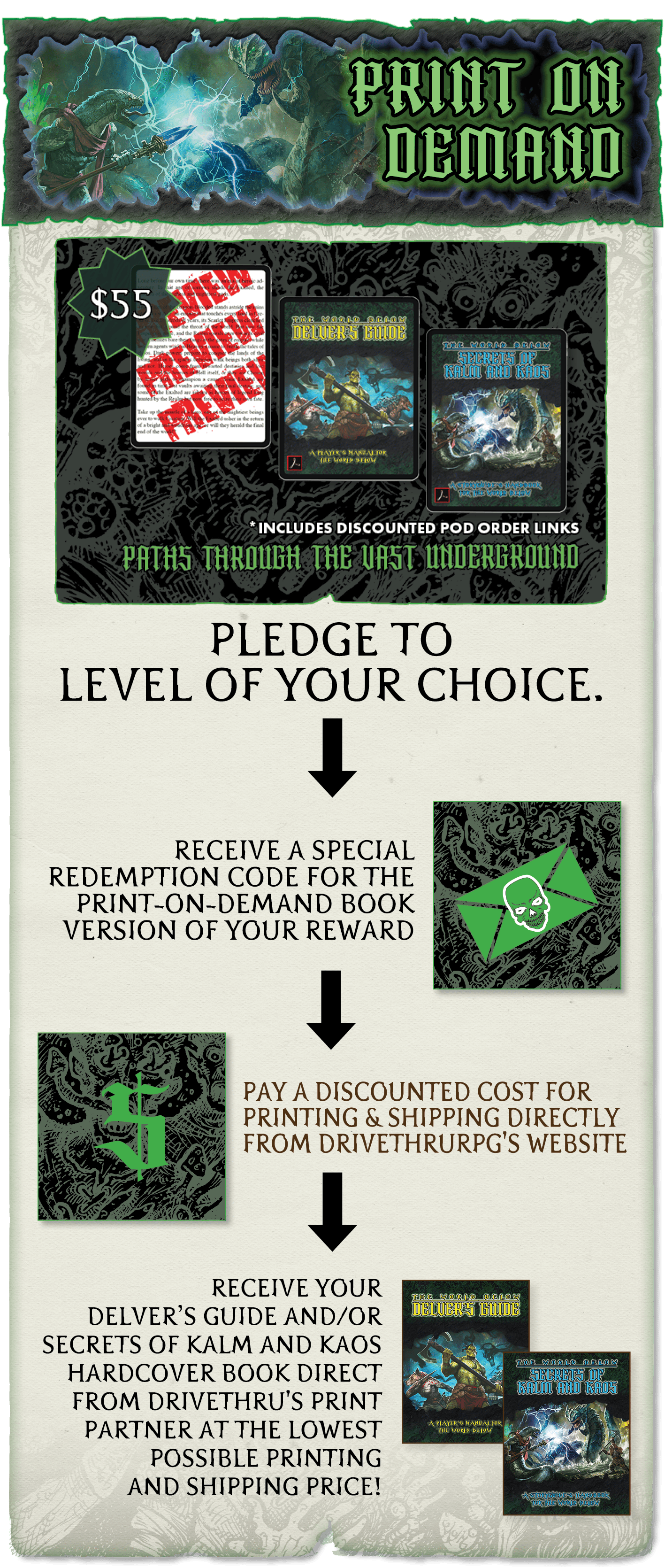 PRINT-on-DEMAND BOOK: In addition to the PDF releases, The World Below: Delver's Guide and The World Below: Secrets of Kalm and Kaos willavailable for purchase as Print-on-Demand hardcover books from our partners at DriveThruRPG. The cost of printing and shipping a PoD book is not part of your pledge amount, however Crowdfunding backers will receive a special link allowing you to purchase the PoD book at a discounted price.