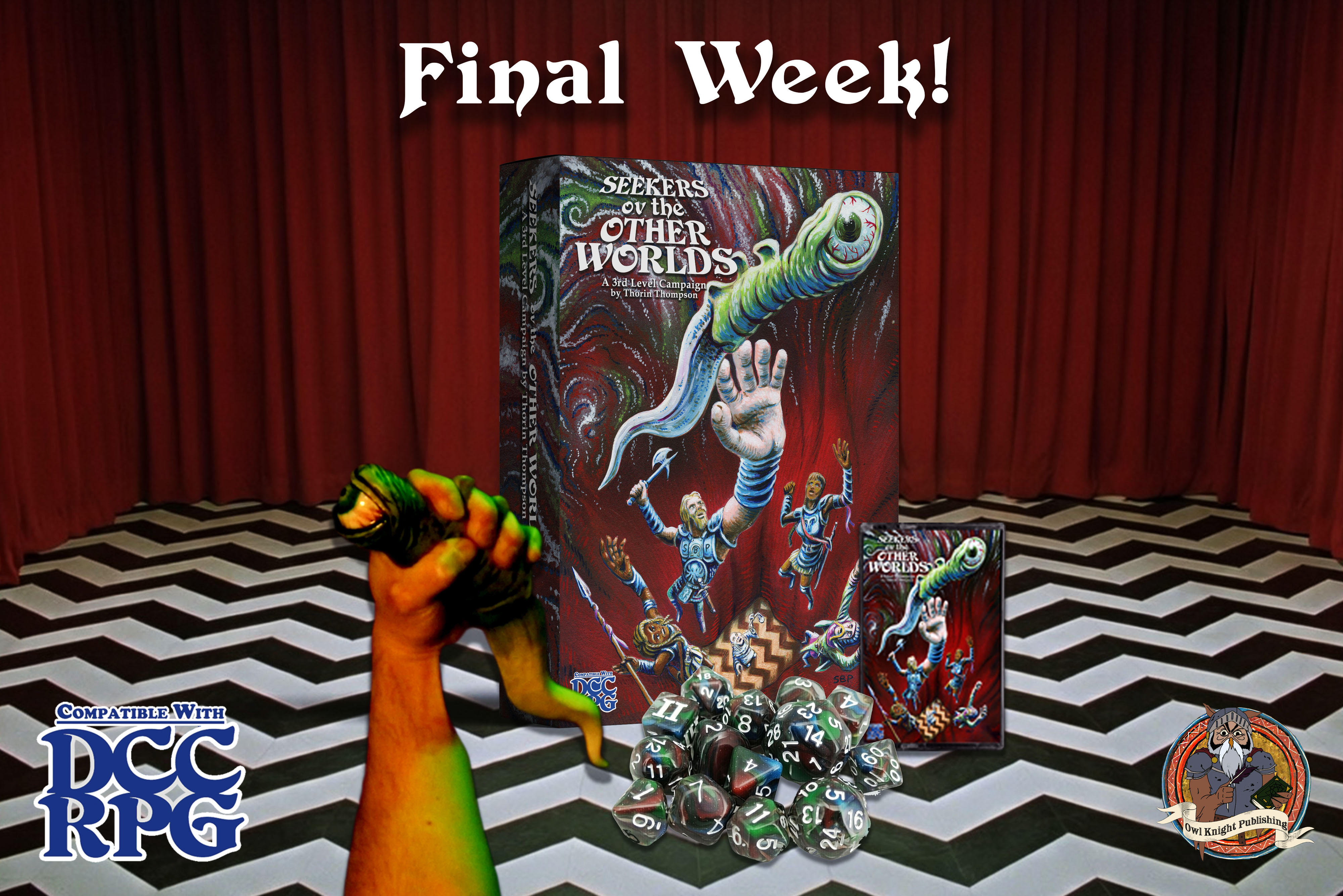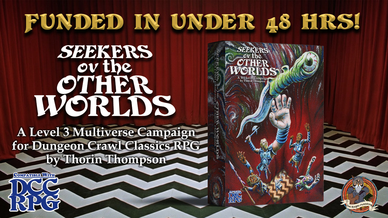 Speaking of, if you're a DCC person (and obviously if you're reading this you more than likely am) I'll be passing up some postcard sized flyers around the convention. If you'd like to help me spread the word and hand them around your gaming table or perhaps take some for another convention let me know and we'll meet up. The more people that know the closer we can be to defeating these stretch goals! (I soooo badly want to unlock the dice add on... The dice goblin inside me craves MORE!)