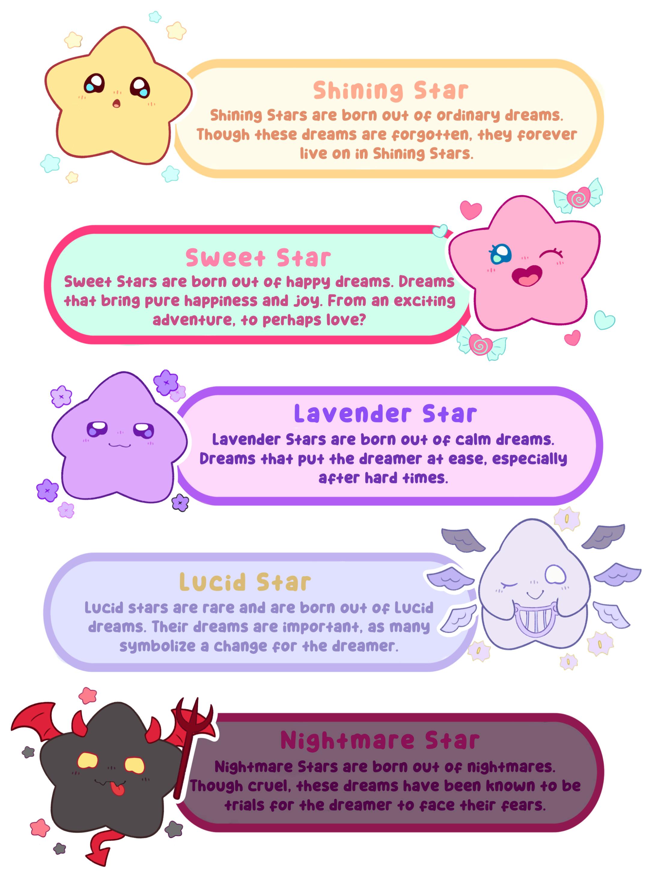 Baby Stars are born from dreams. Each type of dream creates a different star. When they get older, their main jobs will be traveling the cosmos and sharing their unique dreams with others. This process ensures that no two dreams are the same and that new dreams will be created! The Baby Stars stay in Dream Seed fields, looked after by their caretaker, Aurora. A mysterious lady of the cosmos...