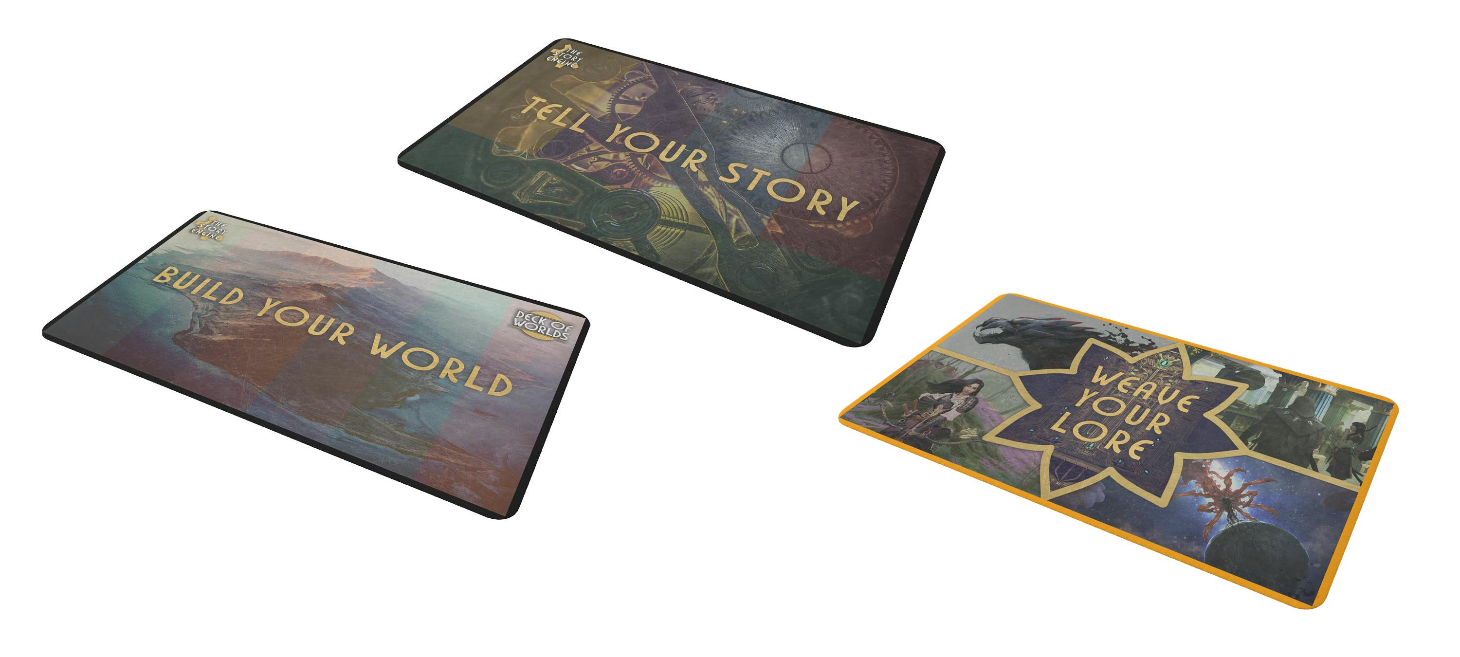 So, as a BackerKit Holiday Market special, we are including all three of our playmats as a thank you for adding the entire Story Engine trilogy to your collection! Our playmats are 18”x12” soft foam, featuring artwork from The Story Engine Deck, Deck of Worlds, and Lore Master's Deck, here to protect your cards from the crumbs of apple crumble and pumpkin pie 🥧