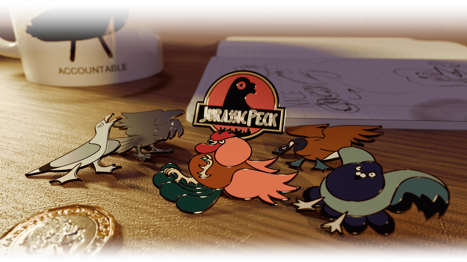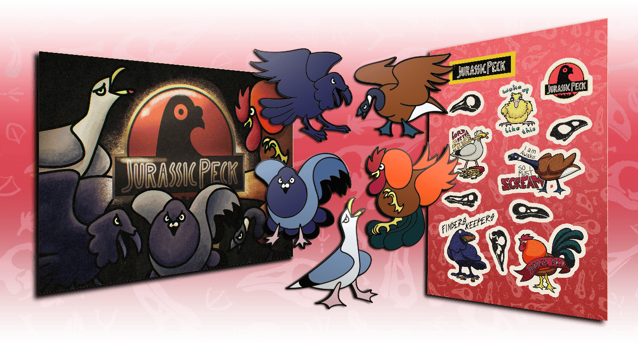 “Modern Dinosaurs” celebrates the prehistoric power of everyday birds with doodle-style enamel pins that parody Jurassic Park and highlight the chaos of our feathered friends.
