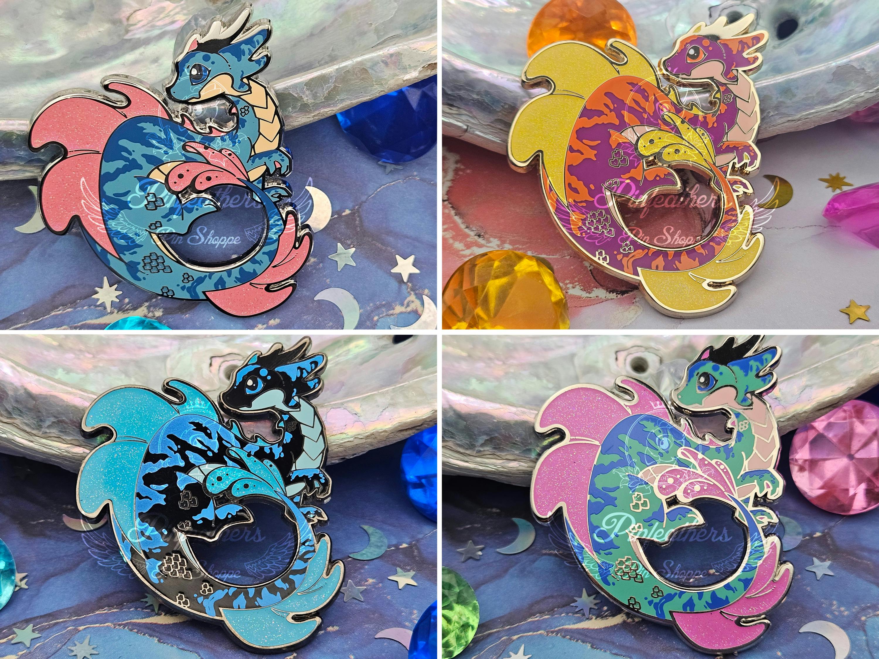 These dragon pins stand at about 2.5" tall and contain glitter and screenprinting accents.