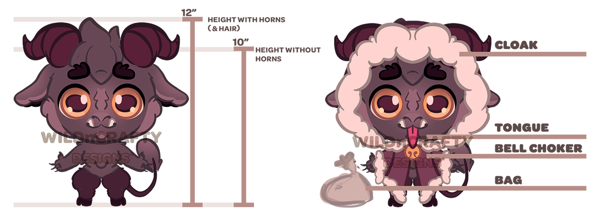 Kidd Krampus will be the first WildnCrafty Companion! This design is for ages 3+, measures to a little over 12 inches ( 304.8 mm ) tall, and comes with four accessories! Two special features about WildnCrafty Companions is that they have magnets sewn into their mouths and hands and all of their clothes and accessories are interchangable! This allows for easy cleaning, dynamic styling, as well as imaginative play! In addition to being slightly weighted, this plush will be weighted to sit when placed, to allow for easy placement.