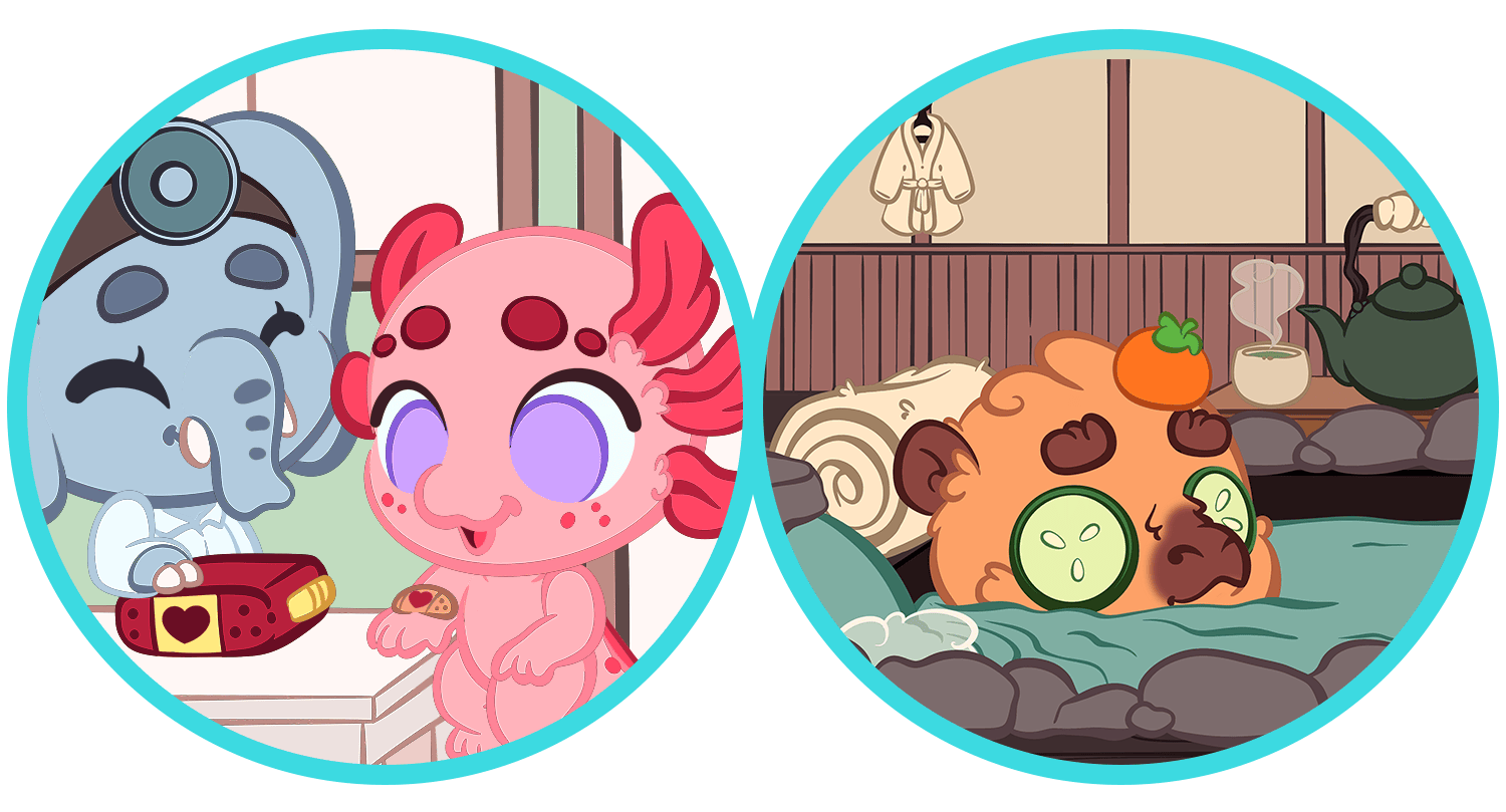 Chibi illustrations depicting two different images of cartoon Plushpanions. Left: An axolotl getting a band-aid from an elephent in a doctor's outfit | Right: A capybara vibing in a spa with cucumbers over their eyes.