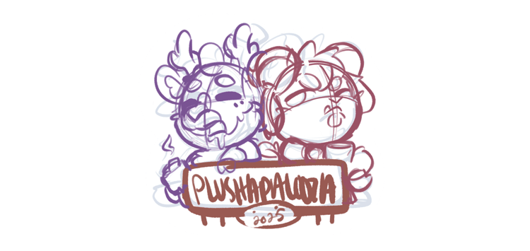 Sketch of Early Bird sticker: Reinhold and Kidd sitting back to back, behind a "Plusha palooza - 2025" sign