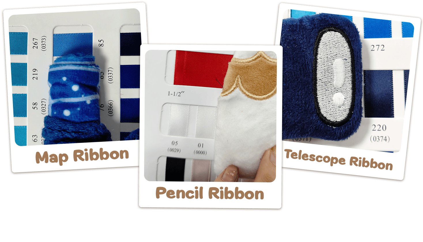 (L): Map compared to blue cobalt ribbon | (C): Pencil compared to white ribbon | (R): Telescope next to navy blue ribbon