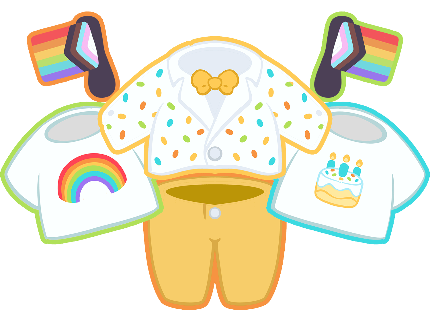 Celebration Clothing Collection: Progress Flag props, Rainbow T-Shirt, Cake T-Shirt, and a Confetti Blazer with matching yellow trousers and bow tie.