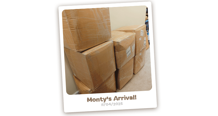 Polaroid-esque graphic of 7 cube boxes, full of Monty! | "Monty's Arrival!" - "11/04/2025"