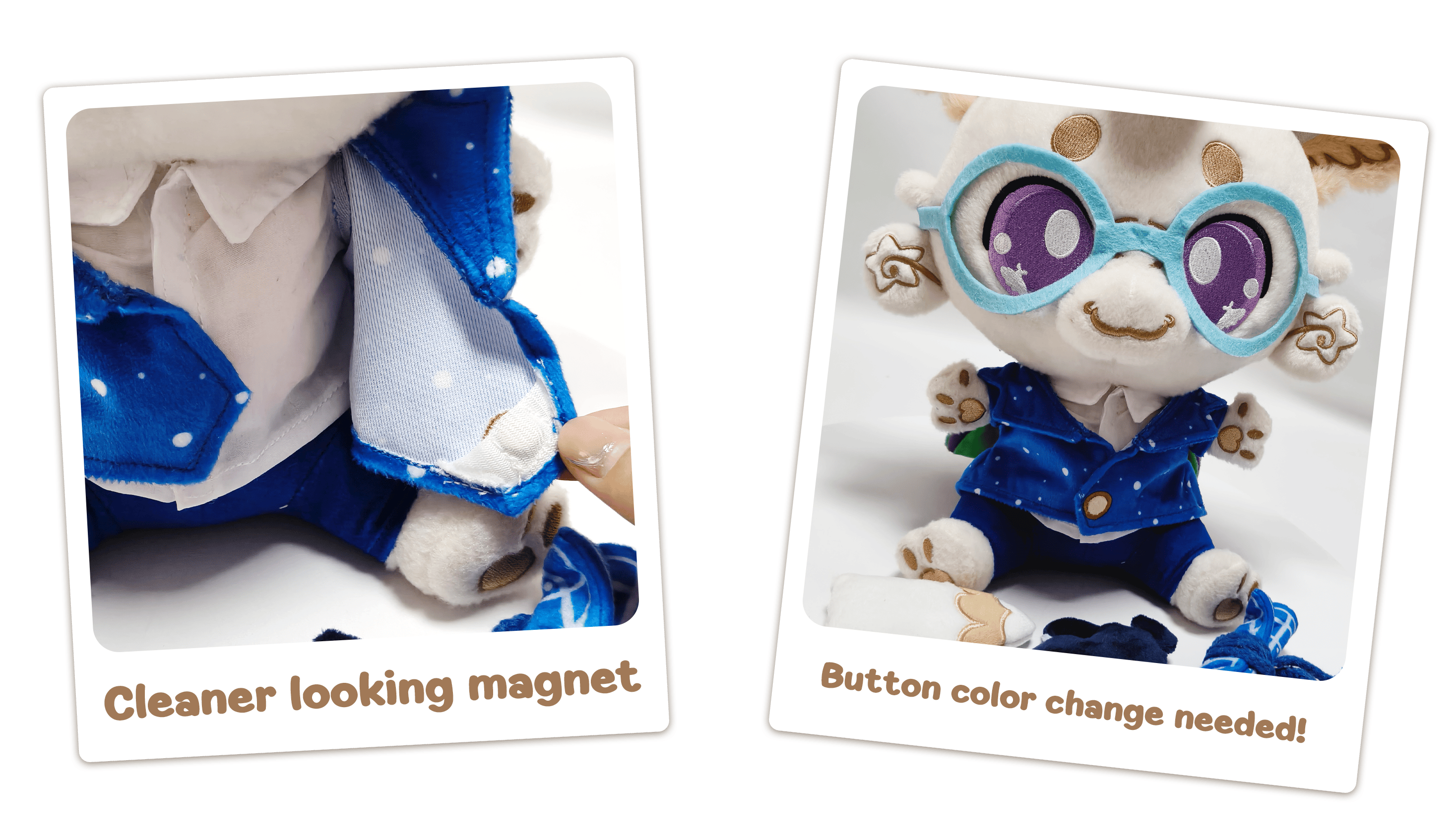 The Notes Requested: 📝 Glasses must be removable, not sewn onto the face. 📝 Both the Night Sky Blazer and White Dress Shirt should have Velcro added to the under side of the wing hole, to allow for easy dressing/undressing. 📝 The map prop should have the string shortened and sewn to the back of the map, so the string is not easily lost. 📝 The props should have larger magnets, that match our current size and standard.