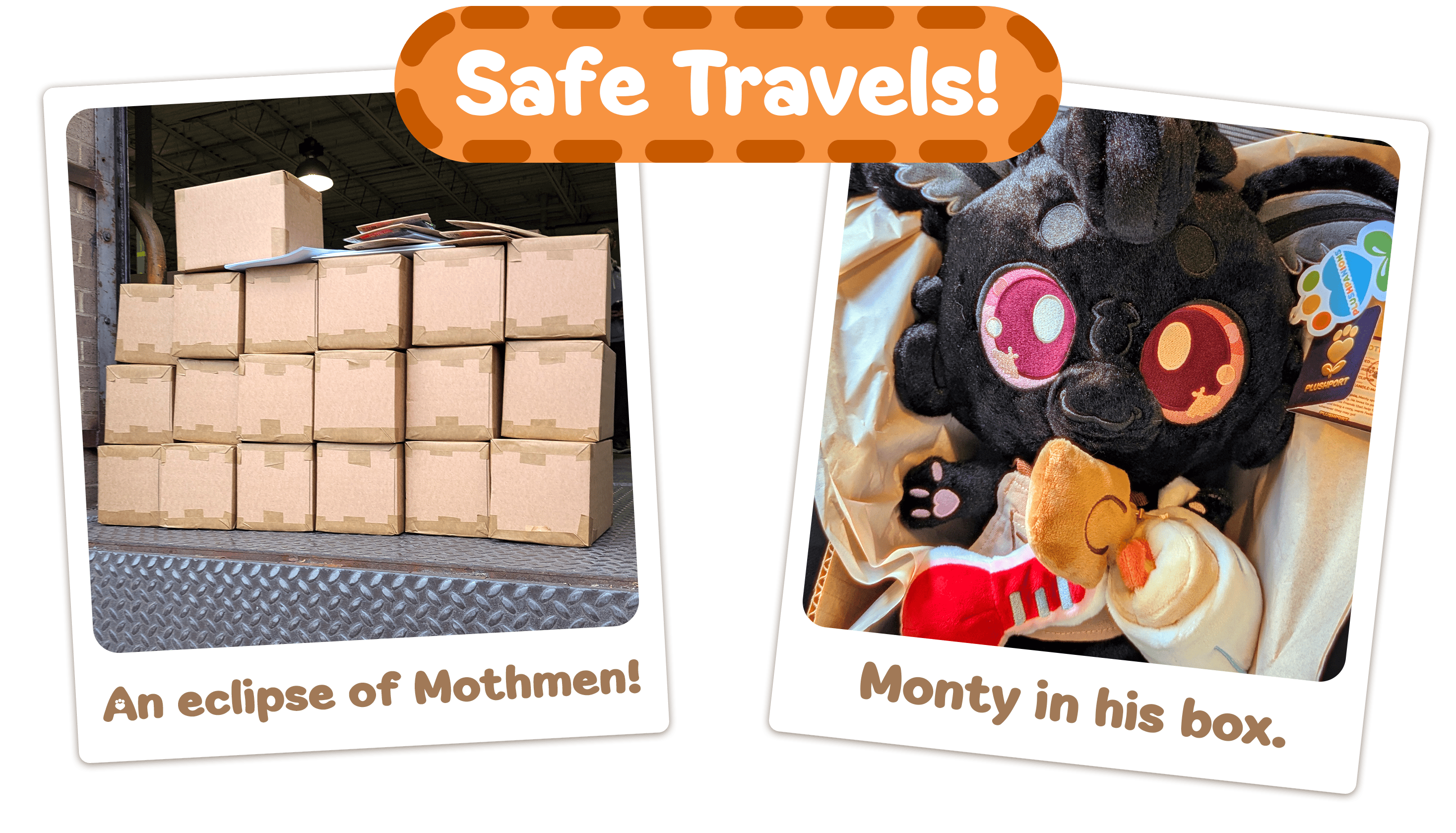 Back to the crux of it... as of right now, I am unable to send out any Monty Mothman plush orders with collab pins included, as I cannot parse out items within a shipment. I will update here and on the Discord as soon as they are located. However, again, if the worst case scenario rears its ugly head, I will have a backup plan ready to go. My sincerest apologies to those who are looking forward to the collab pin, please know that I did my best with swift follow-ups at all stages, but be prepared for any scenario.