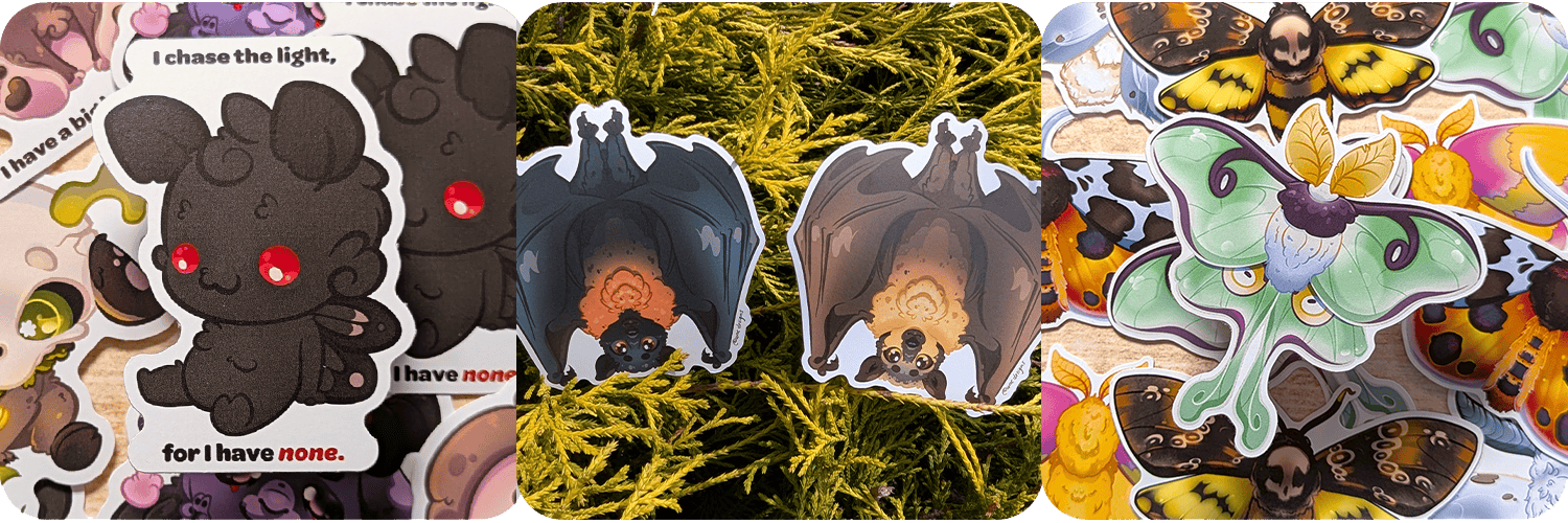From moths, to bats, foxes, and more, you can give yourself the gift of mystery, by letting us select three stickers for a discounted bundle of stickers! There are also theme-specific mystery bundles, like Moth, Animals, or Cryptids, so you can be sure you're getting your favorites!