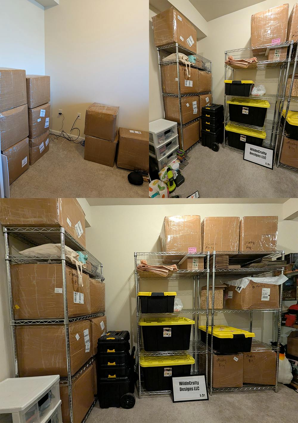 A photo showcasing the "Before/After" of the corner of a carpeted room. Before is a stack of 9 boxes, the After has the boxes, plus some more, staked onto wire shelves. The lower photo shows all three new shelves, full of boxes and bins.