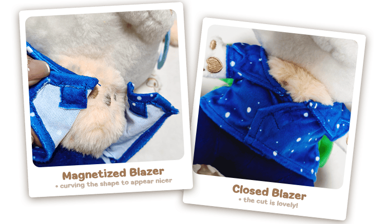 As mentioned previously, I've asked for the cufflinks circle to be moved closer to the opening of the sleeve. And finally, in addition to the ribbons, we will also be adding a logo tag to the blazer - much like Monty's apron! This is so that if the clothing is seen separately from the plush, the brand can be easily identified.