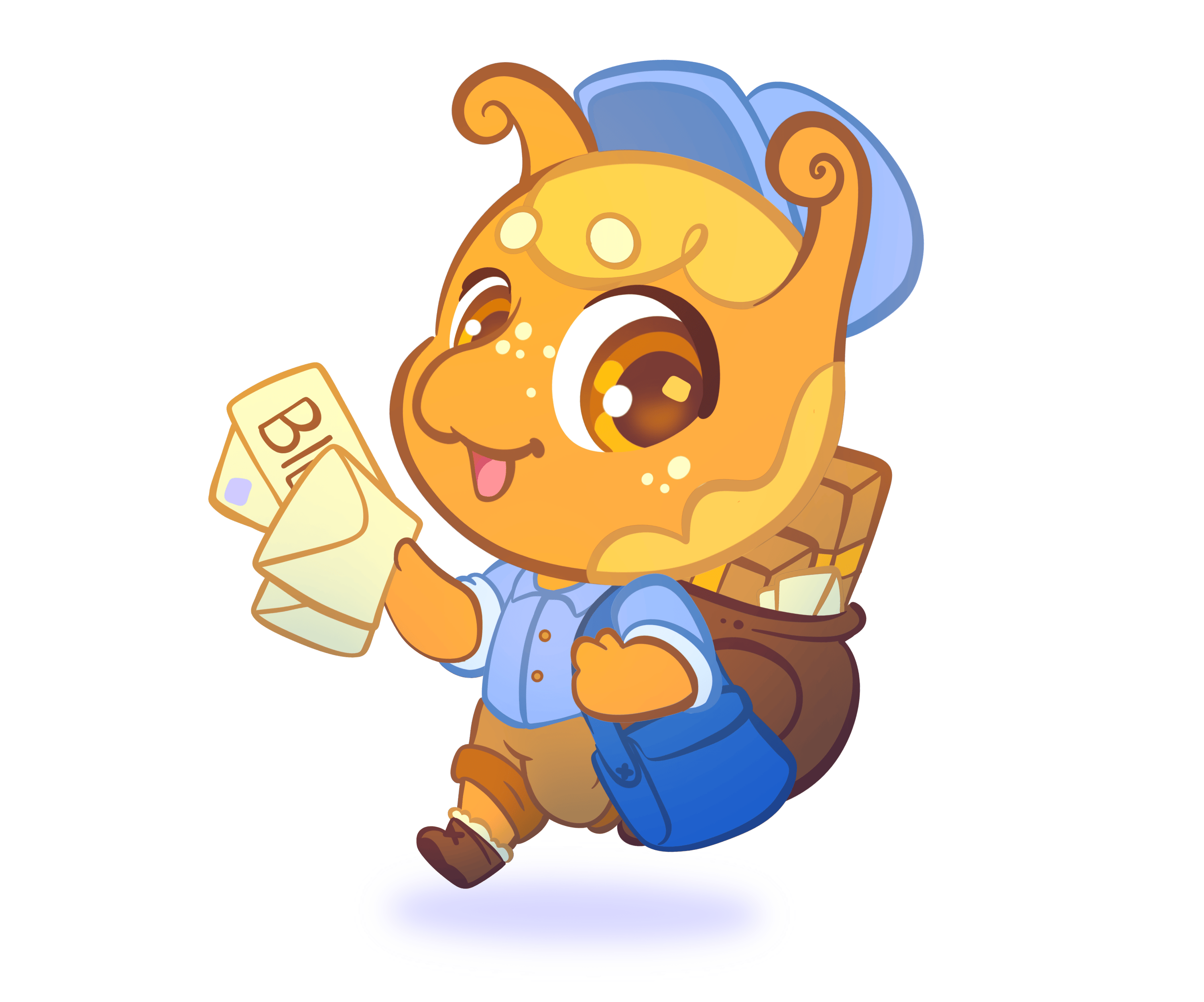 Snail Mail: Illustration of yellow snail mail carrier with blue and tan post outfit - carrying mail in hand, bag and shell.