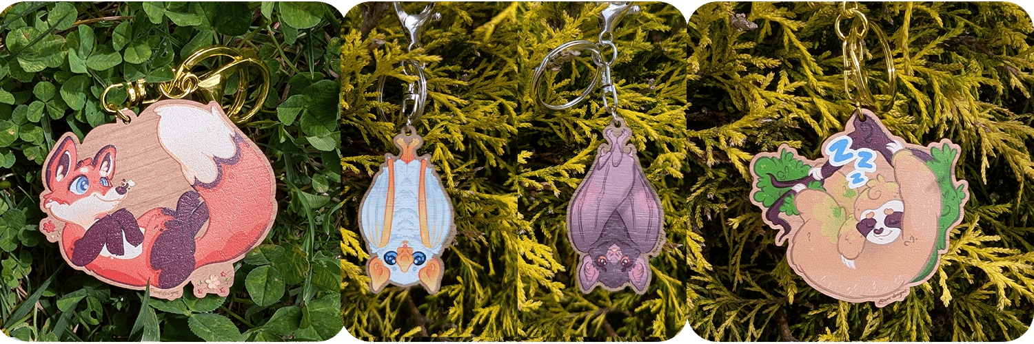 From Left to Right: Fox keychain (gold chain) | Honduran White Bat and Brown Vampire Bat (silver chains) | Sloth (gold)