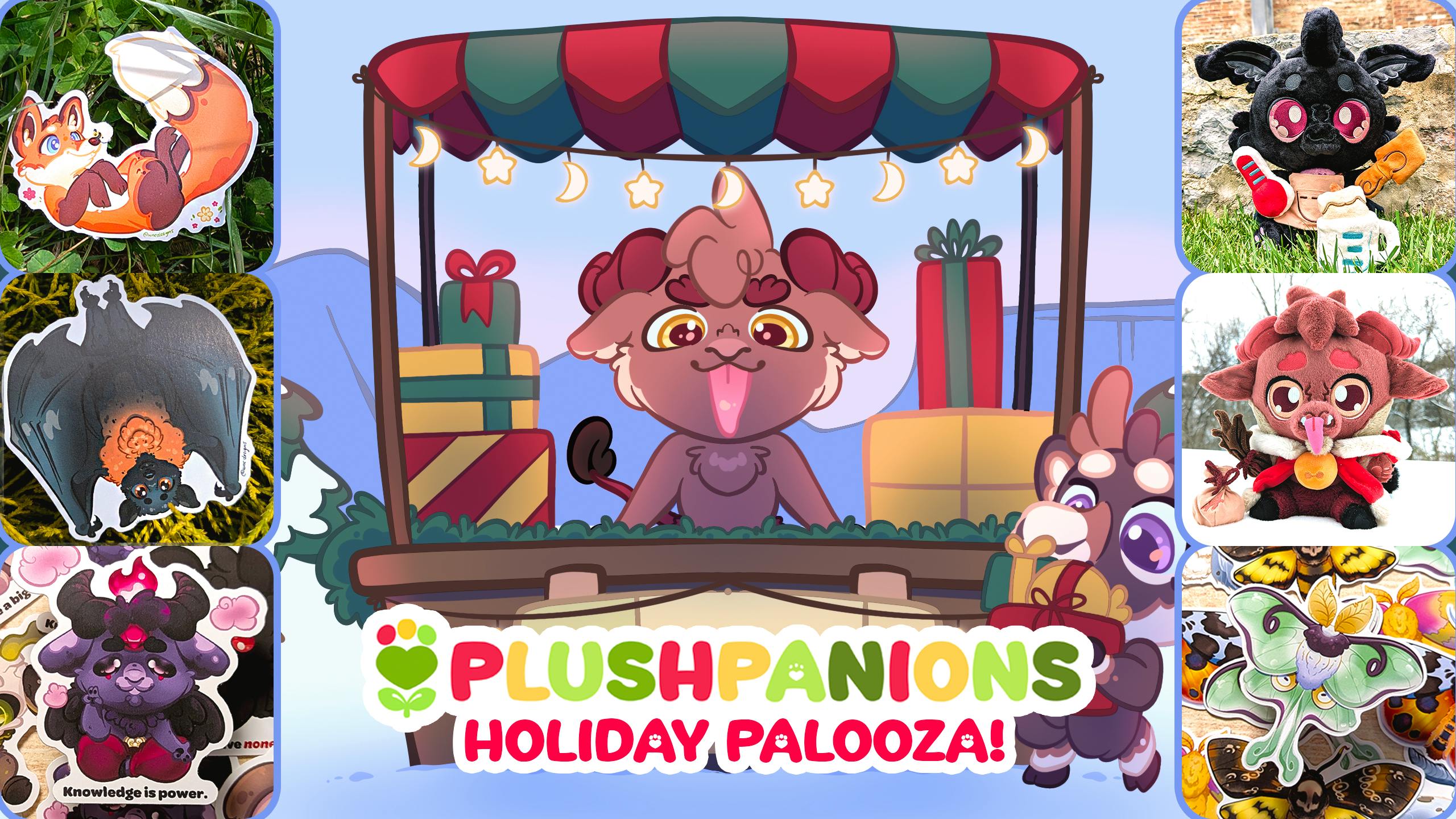 "Plushpanions Holiday Palooza!" Graphic showcasing Kidd and Reinhold manning a wintery vendor booth.