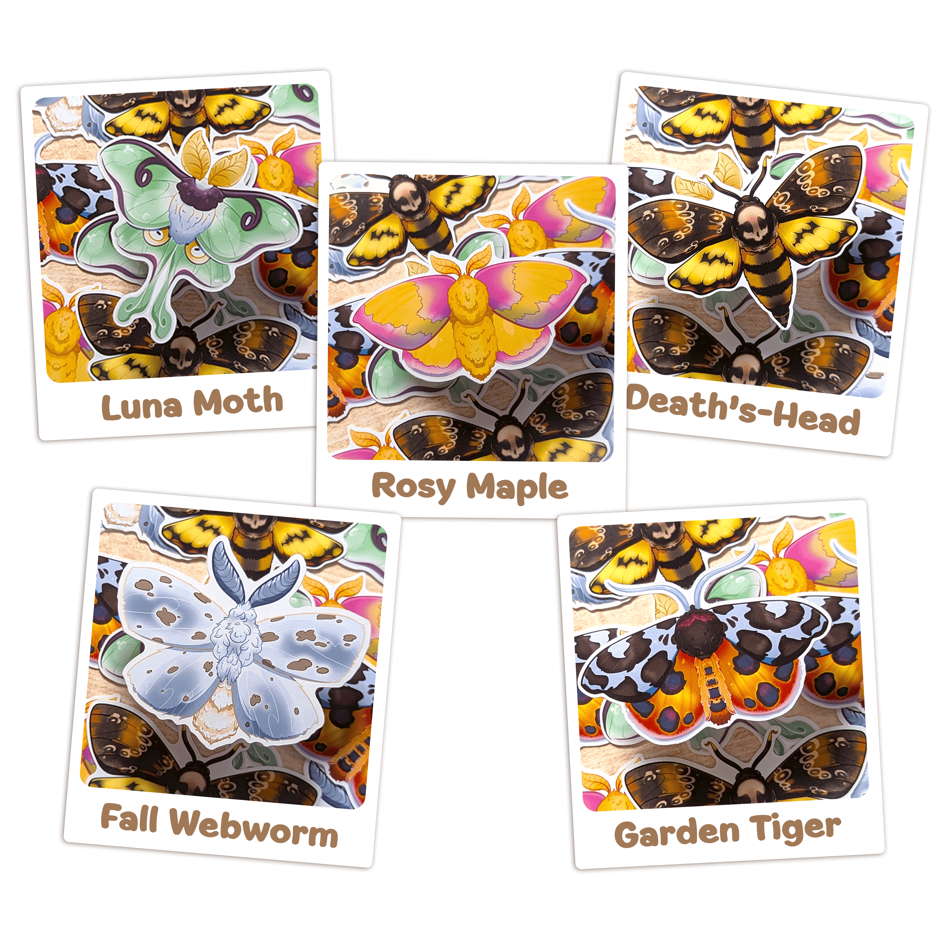 Sticker Showcase - Moths: Luna, Rosy Maple, Death's-Head, Fall Webworm, & Garden Tiger