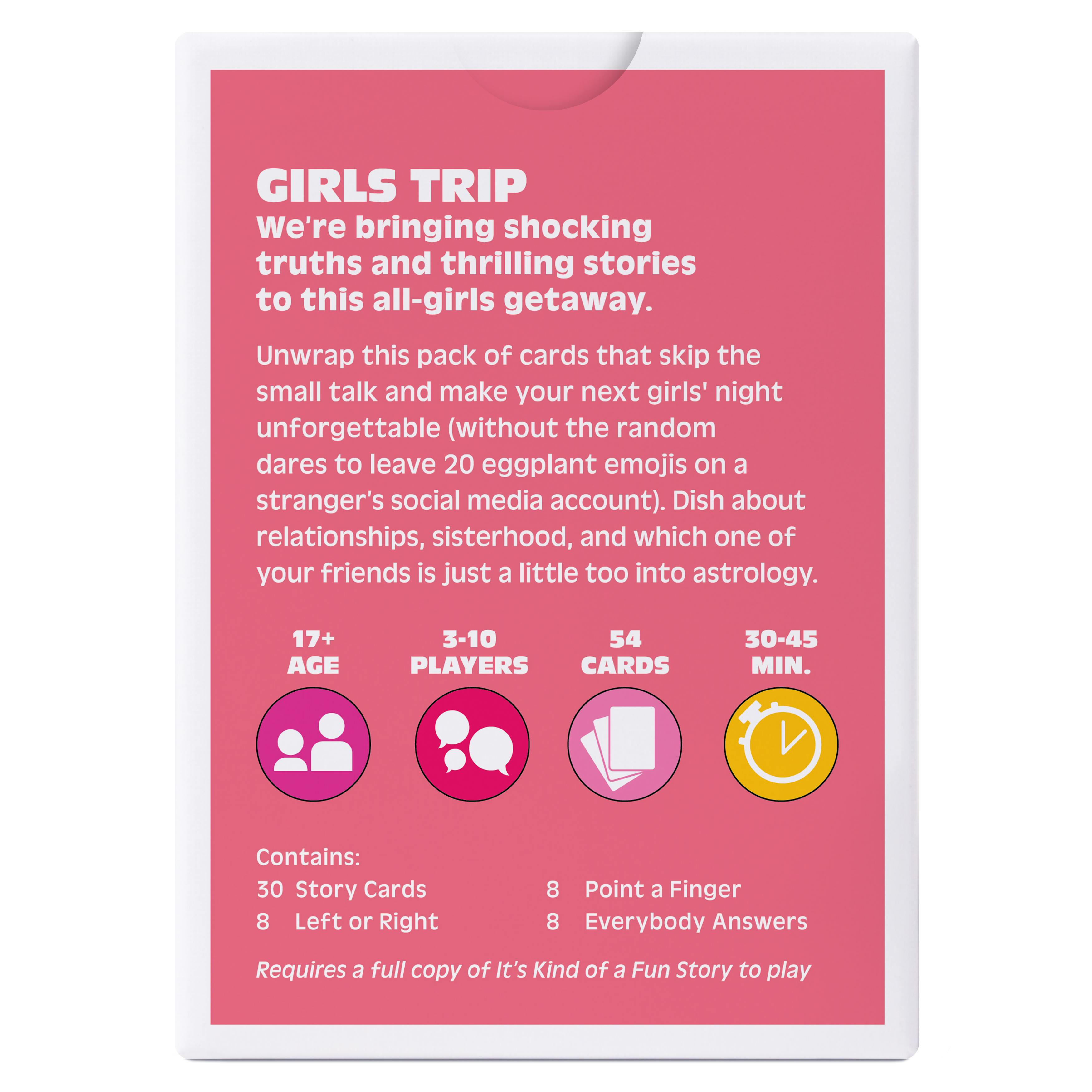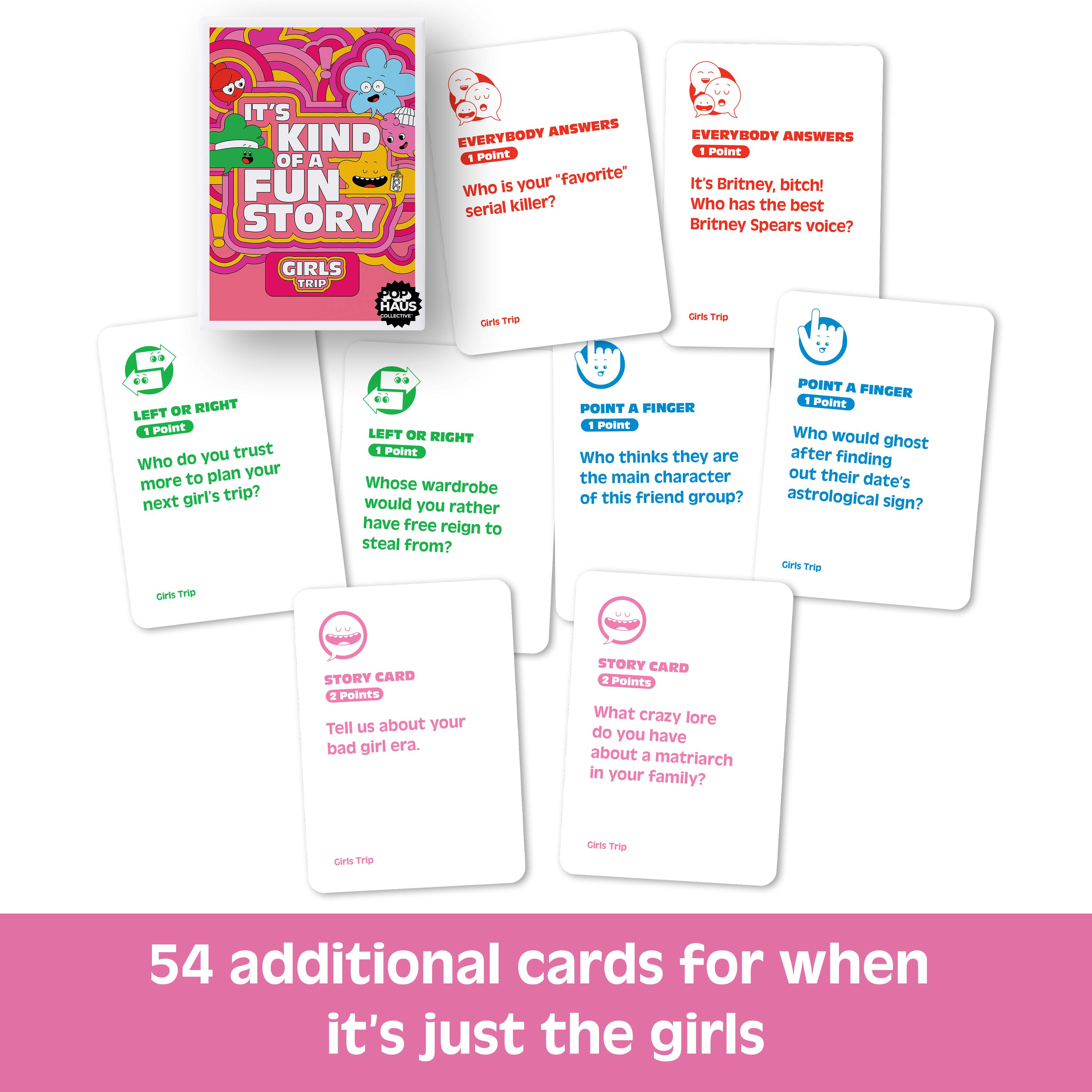 THIS ONE IS FOR THE GIRLS: Make your girls’ night or bachelorette party unforgettable with the Girls Trip Expansion Pack for It’s Kind of a Fun Story. Featuring 54 new cards, this deck encourages shocking truths, hilarious confessions, and inside jokes about relationships, sisterhood, and astrology obsessions. Perfect for pre-parties, adult game nights, or any girls’ getaway. Each card is clearly marked so you can easily mix them in or keep them separate depending on your group’s vibe.