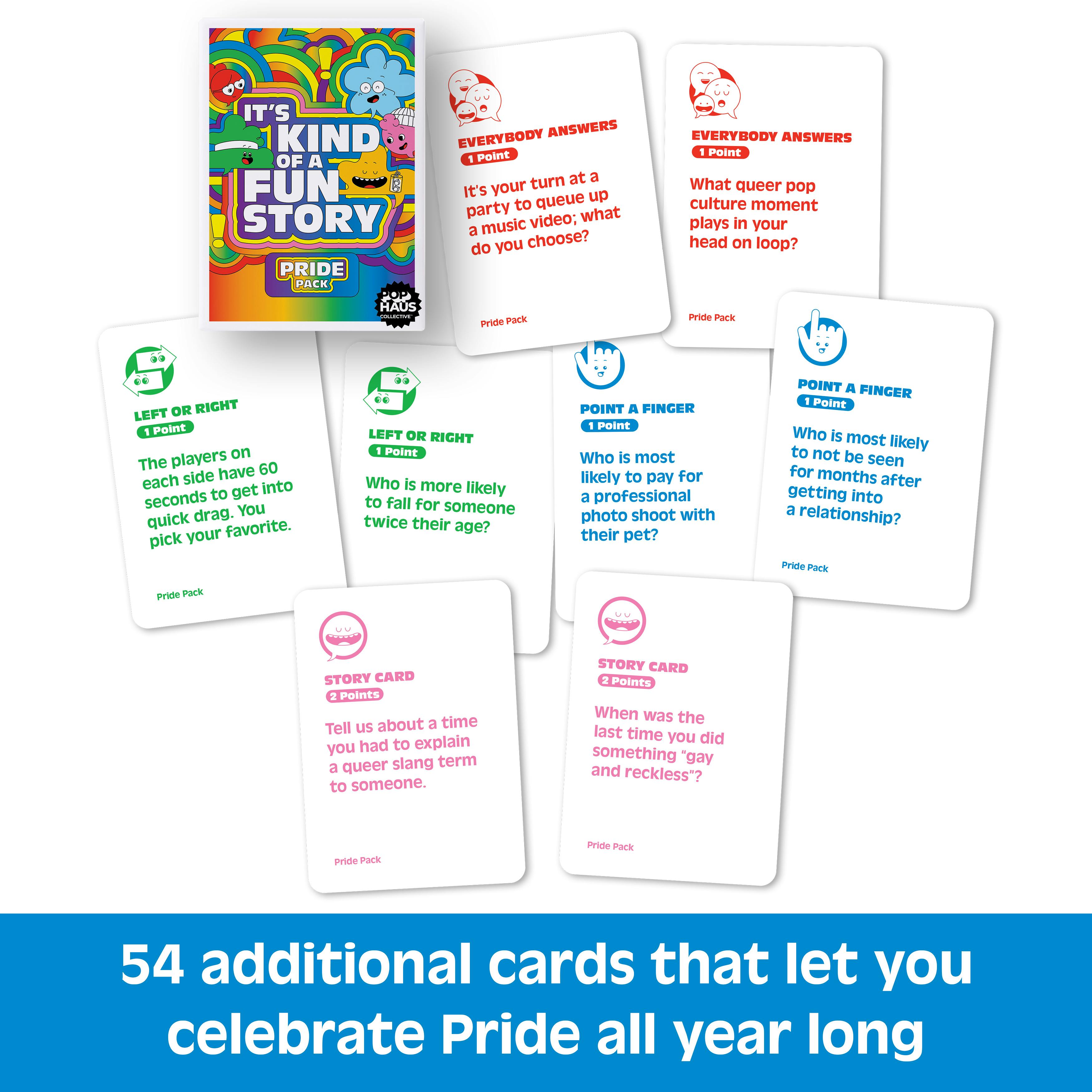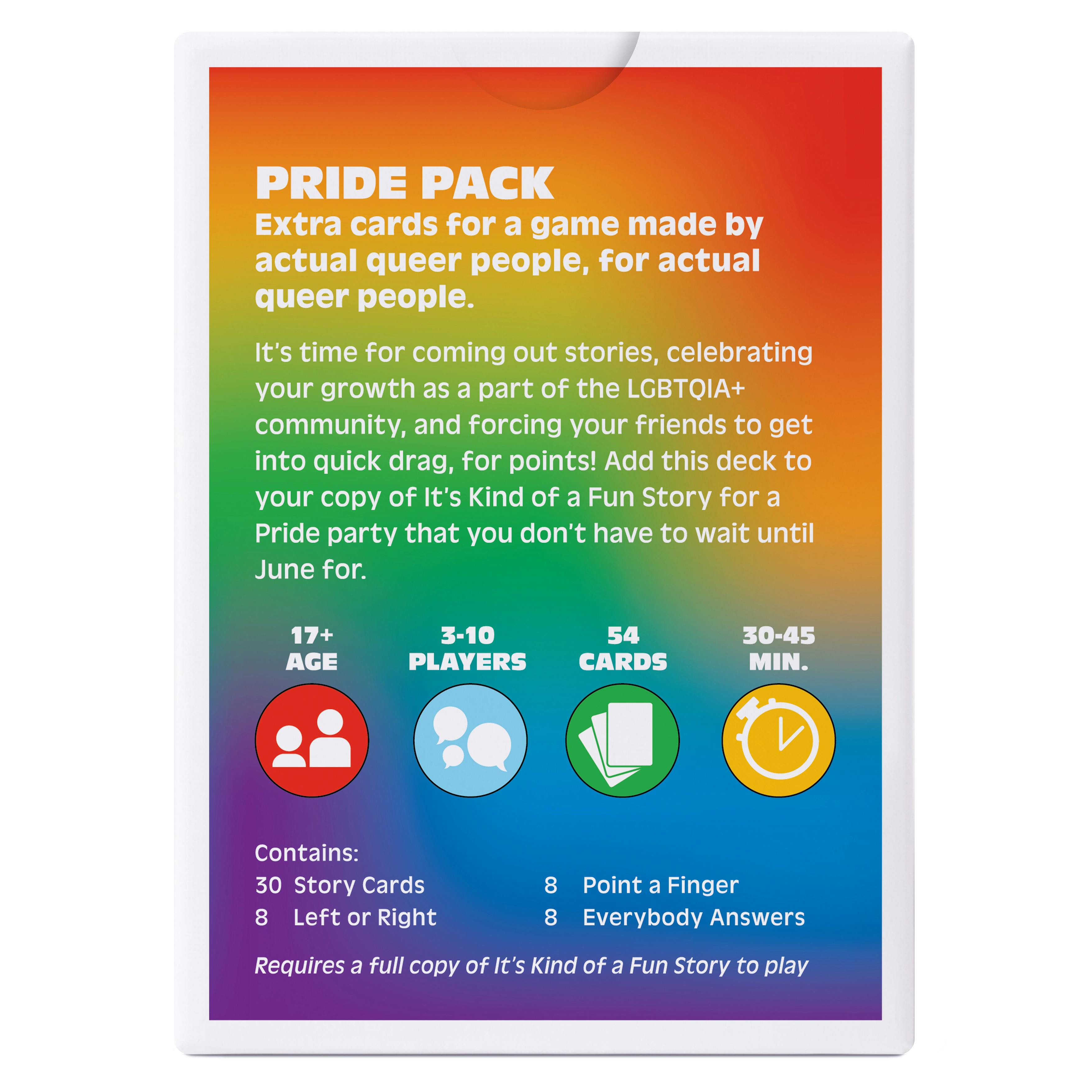 PRIDE ALL DAY, EVERYDAY: Celebrate queer stories, laughter, and community with the Pride Pack Expansion for It’s Kind of a Fun Story. Featuring 54 new cards inspired by LGBTQIA+ experiences, this deck invites players to share heartfelt stories, hilarious memories, and chaotic moments of queer joy. Perfect for Pride parties, late-night hangs, or everyday celebrations of authenticity. Each card is clearly marked so you can easily mix them in or keep them separate depending on your group’s vibe.