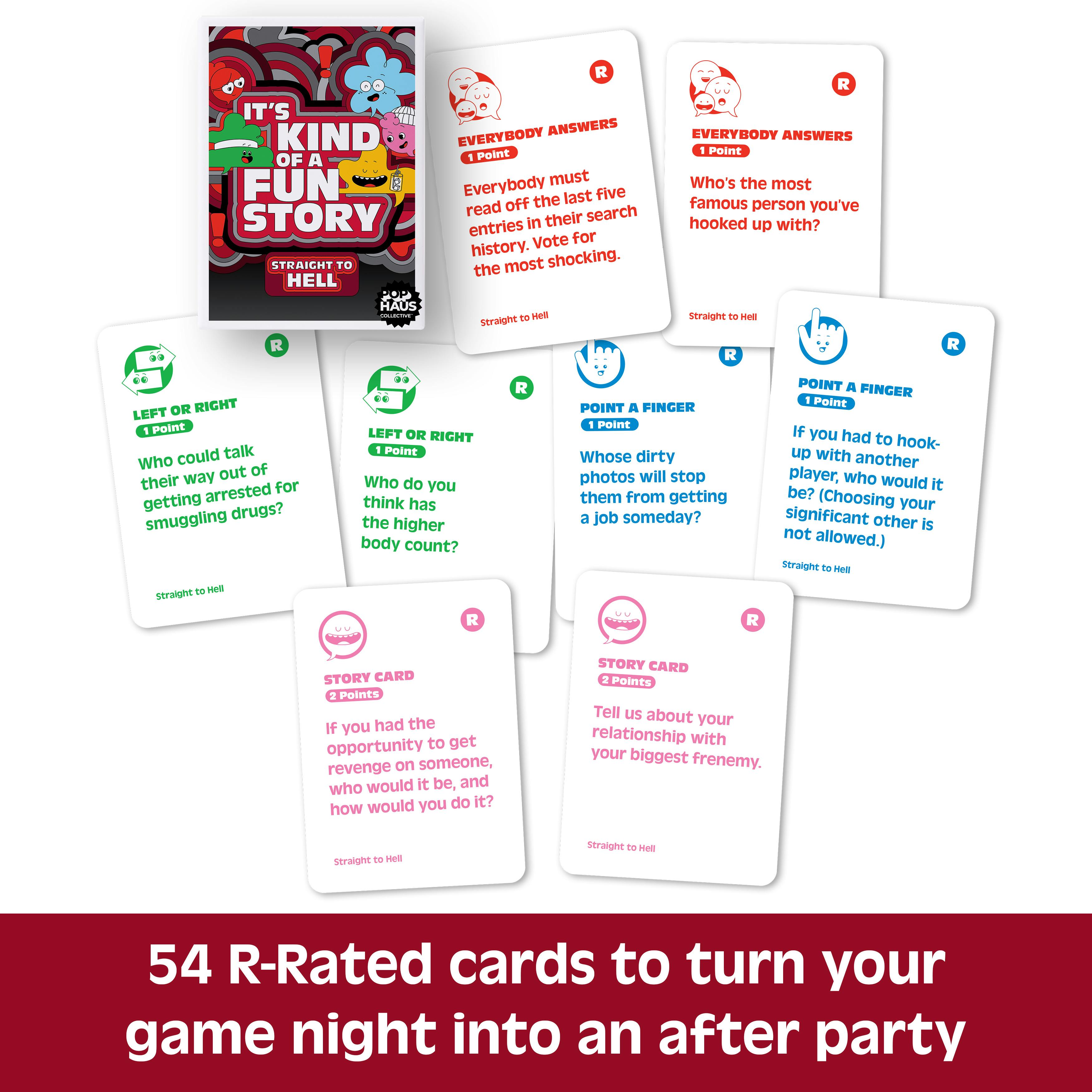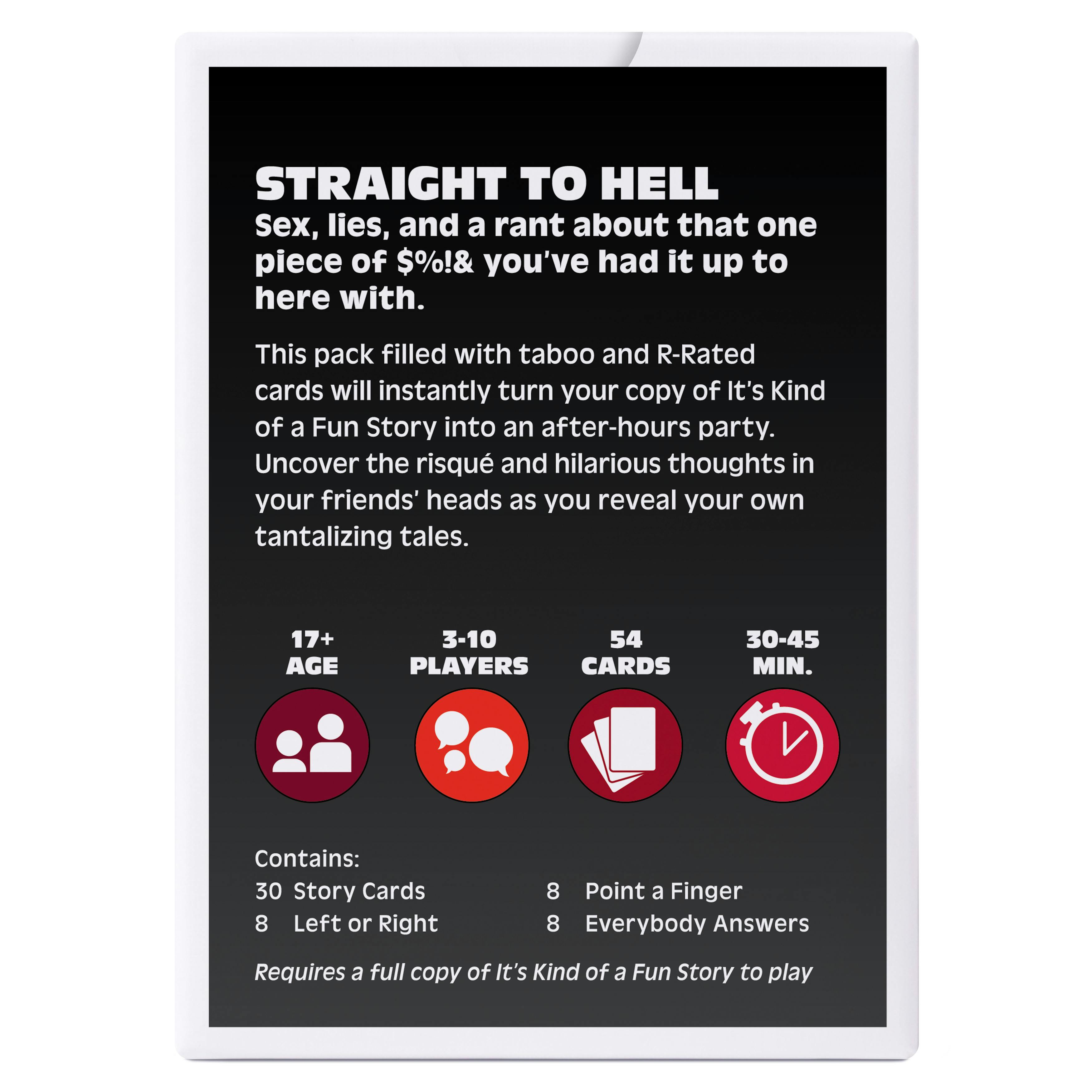 DARK CARDS FOR DARK MINDS: Turn your game night up a notch with the Straight to Hell Expansion Pack for It’s Kind of a Fun Story. This 54-card deck adds bold new prompts designed for late-night laughs, wild confessions, and unforgettable storytelling moments. Whether you’re playing with close friends or your most unfiltered crew, these cards spark hilarious, over-the-top conversations every time. Each card is clearly marked so you can mix them in, or keep them separate, depending on your group’s vibe.