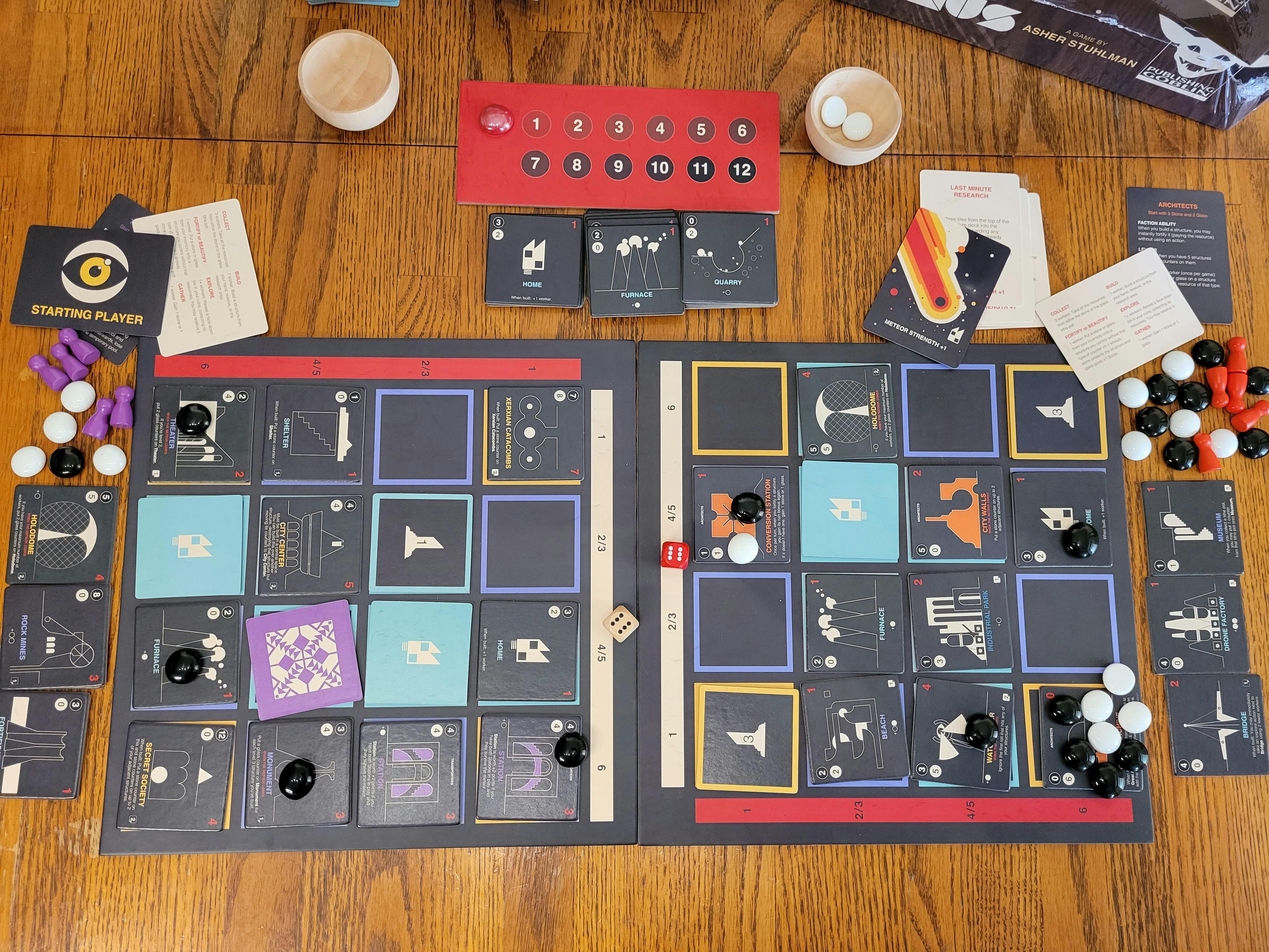 Then gather your starting resources and claim your foundation's unique structure tiles and set them beside your board.