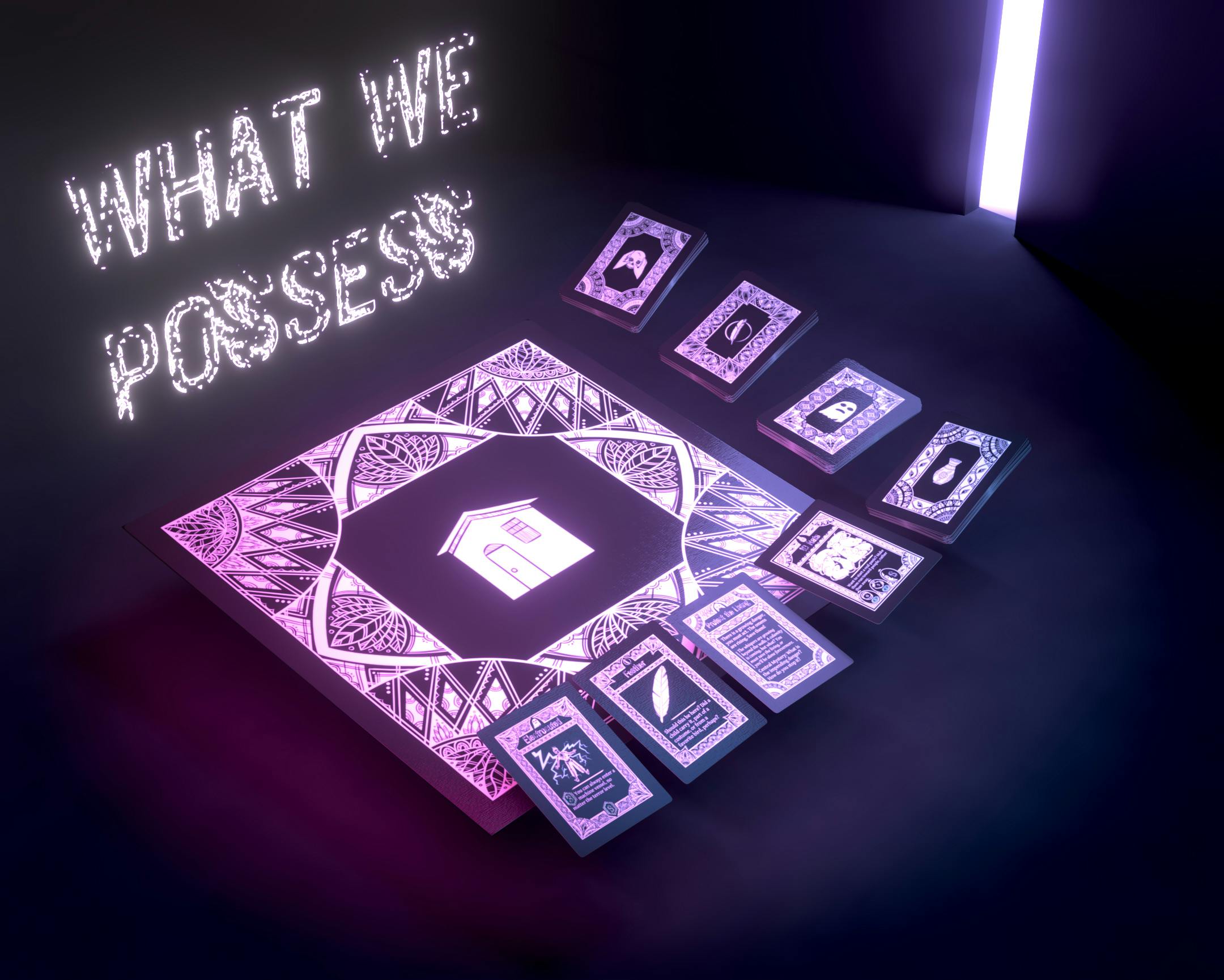 All three games on this project are card-based roleplaying games. ZOETROPE and WHAT WE POSSESS use their own special cards, while SECRET HALLS makes use of a playing card deck for its gameplay. While it comes with a special made playing card deck, any standard deck of cards work for the gameplay.