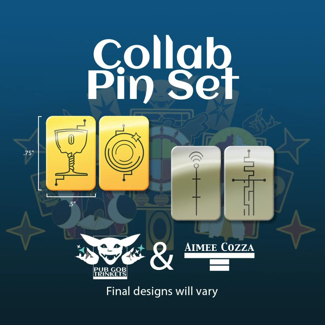 First off, we have our project collab with Aimee Cozza's incredible robot pin set! If you are getting a pinset from each of us right now, you also get our collab 4-pin mini pin arcana set, with a little robo-flair. I provided the gold pins with Cups and Disks, and Aimee put together the silver Wands and Swords!